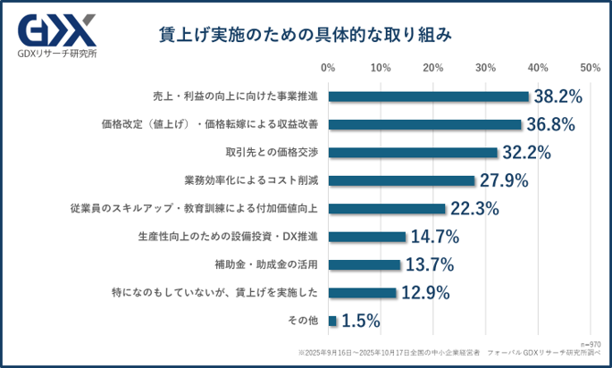 一方で、Q1で賃上げを実施したと回答した経営者に賃上げを実現するために、どのような取り組みを行ったかを尋ねた質問では、「売上・利益の向上に向けた事業推進」(38.2%)、次いで「価格改定(値上げ)・価格転換による利益改善」(36.8%)、「取引先との価格交渉」(32.2%)と継続的な賃上げを行うためには、健全な経営とともに売上・利益を増加させ、賃上げの原資を確保しなければならないことがわかりました。