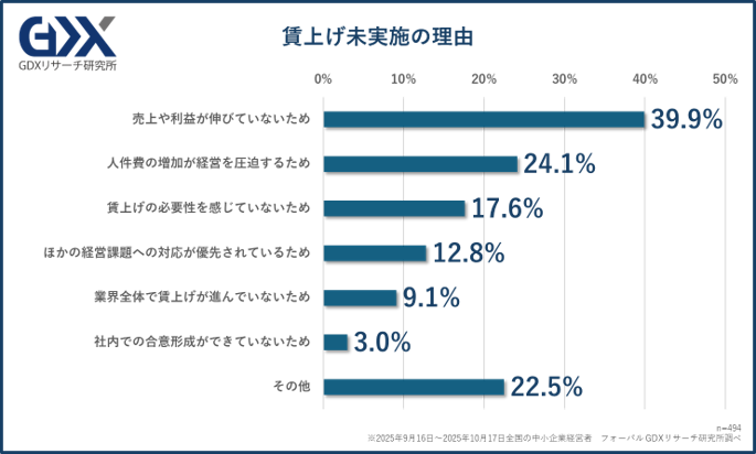 Q1で賃上げを実施していないと回答した経営者に賃上げを実施していない理由を尋ねた質問では、「売上や利益が伸びていないため」(39.9%)という回答が約4割を占め最も多く、次いで「人件費の増加が経営を圧迫するため」(24.1%)、「賃上げの必要性を感じていないため」(17.6%)が続きました。やはり、賃上げを実施するにあたっての理由として大きいのは、賃上げに対する同業界の動きや賃上げも重要ですが、賃上げをする以前に売上・利益が伸びていないために、その結果として賃上げのための資金が足りないということがわかります。