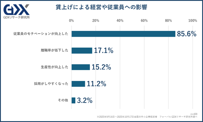 また、実際に賃上げの効果を感じた経営者に対して、どのような効果を感じたかを問うと、「従業員のモチベーションが向上した」という回答が85.6%と最も多い回答となり、効果を感じた回答者は、賃上げを実施するための理由を達成していると考えられます。