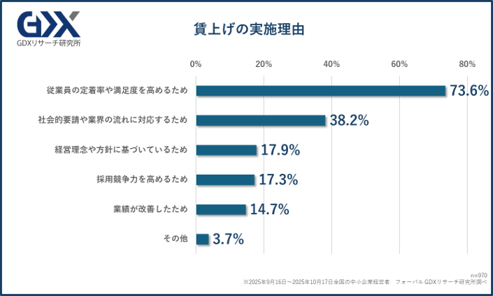 賃上げを実施したと回答した経営者が賃上げを実施した理由は、「従業員の定着率や満足度を高めるため」が73.6%と群を抜いて多い回答となりました。次いで、「社会的要請や業界の流れに対応するため」(38.2%)、「経営理念や方針に基づいているため」(17.9%)、「採用競争力を高めるため」(17.3%)という結果でした。