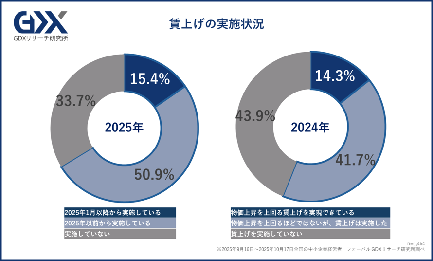 中小企業の経営者を対象に賃上げの実施状況を問う設問では、「2025年1月以降に実施している」が15.4%、「2025年以前から実施している」が50.9%と、6割以上の企業が賃上げを実施しているものの、いまだ33.7%の企業が実施できていないという現状がわかりました。