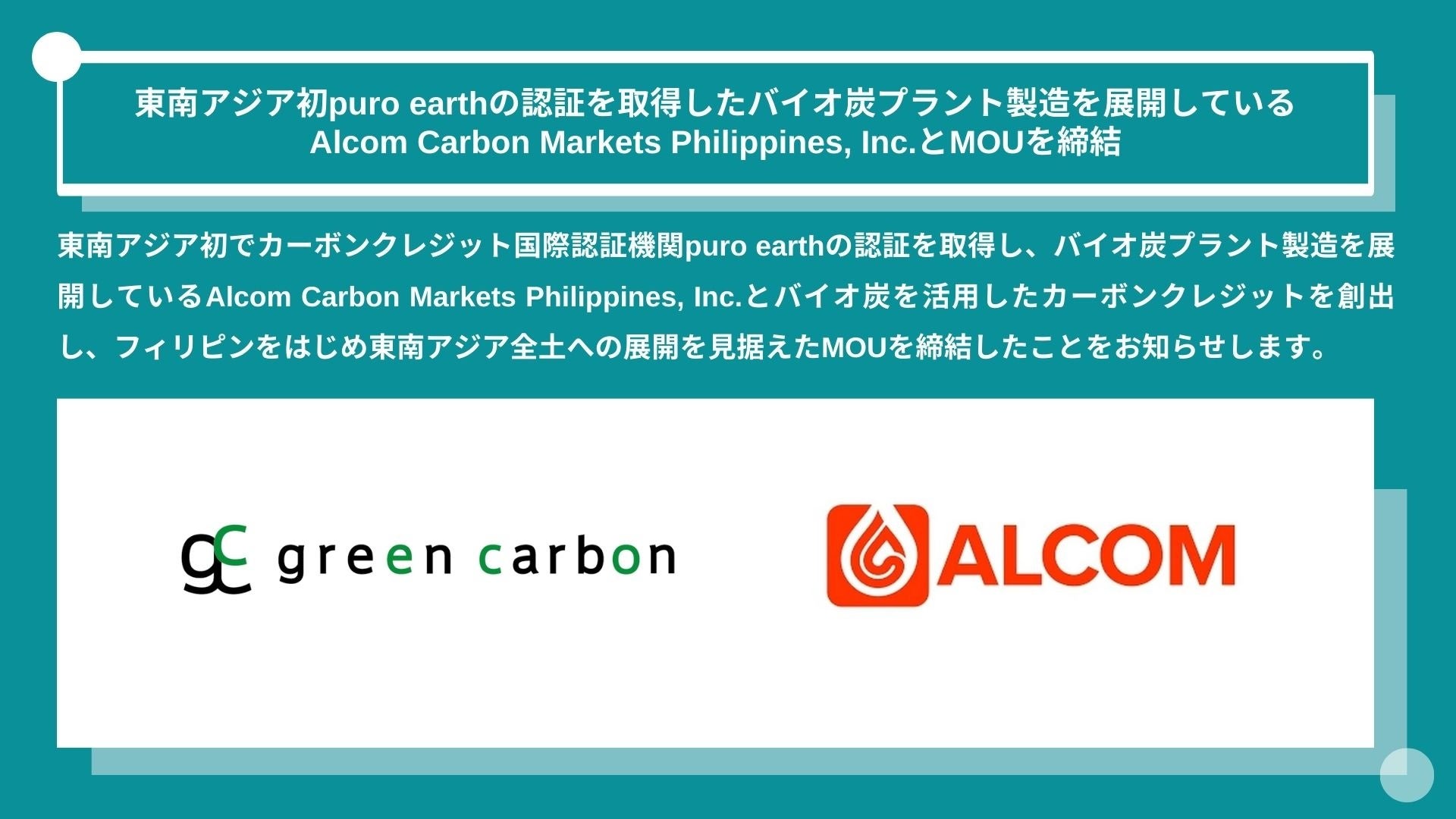 Green Carbon株式会社(代表取締役:大北潤、以下Green Carbon(読み:グリーンカーボン))はこの度、東南アジア初でカーボンクレジット国際認証機関*¹puro earthの認証を取得し、バイオ炭プラント製造を展開しているAlcom Carbon Markets Philippines, Inc.(Founder and Managing Director:Prateek Tiwari、以下Alcom(読み:アルコム))とバイオ炭を活用したカーボンクレジットを創出し、フィリピンをはじめ東南アジア全土への展開を見据えたMOUを締結したことをお知らせします。