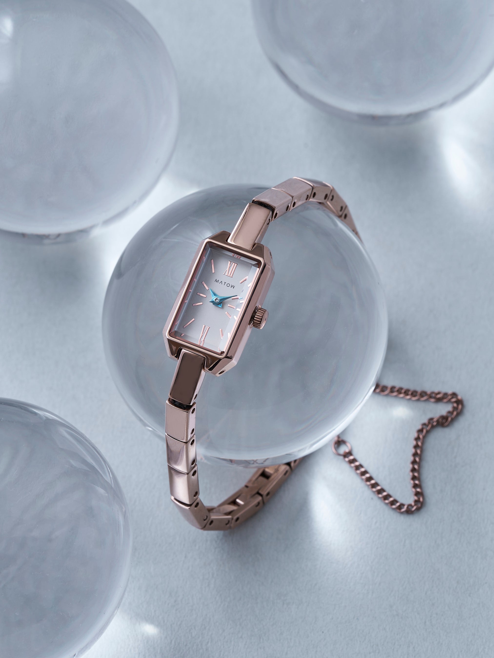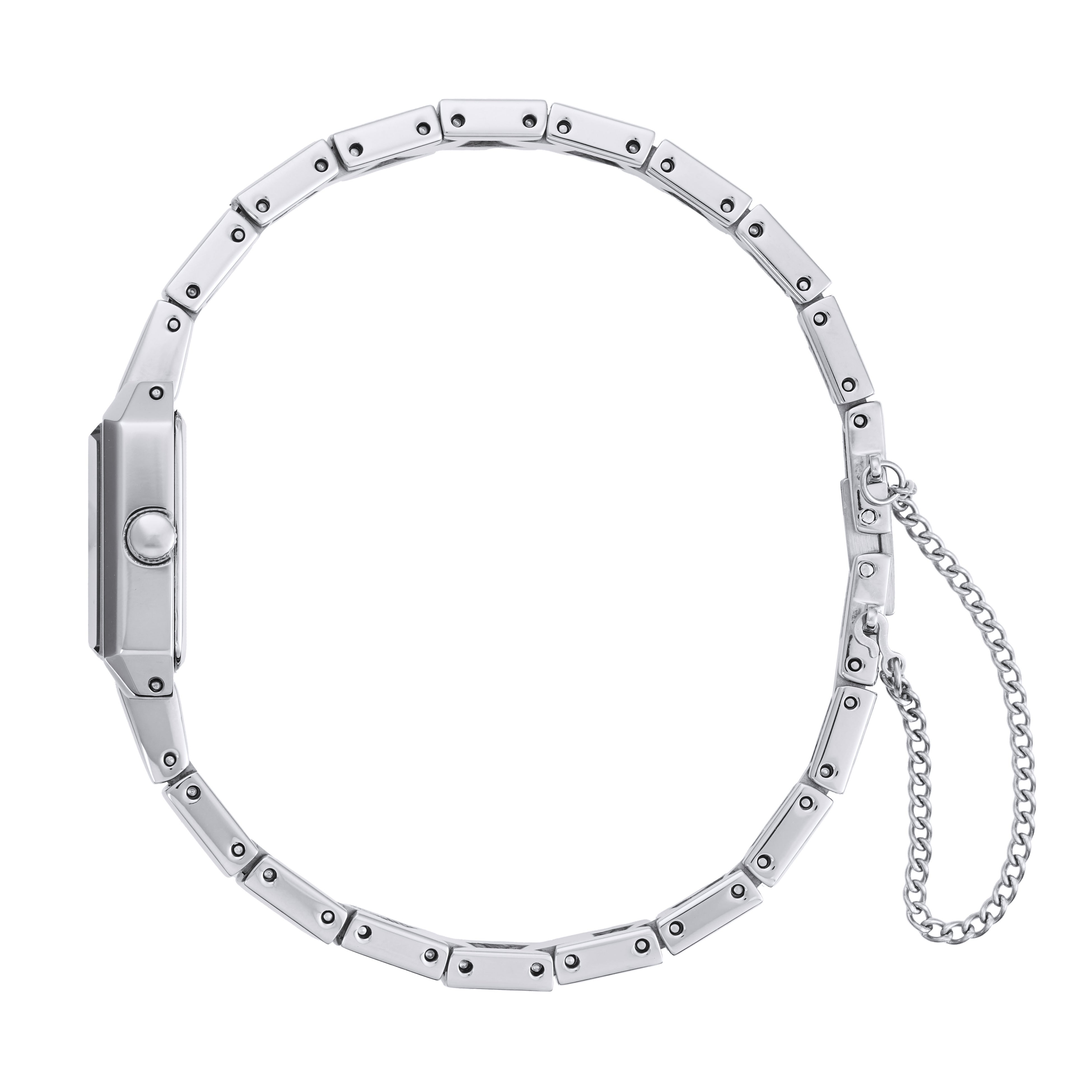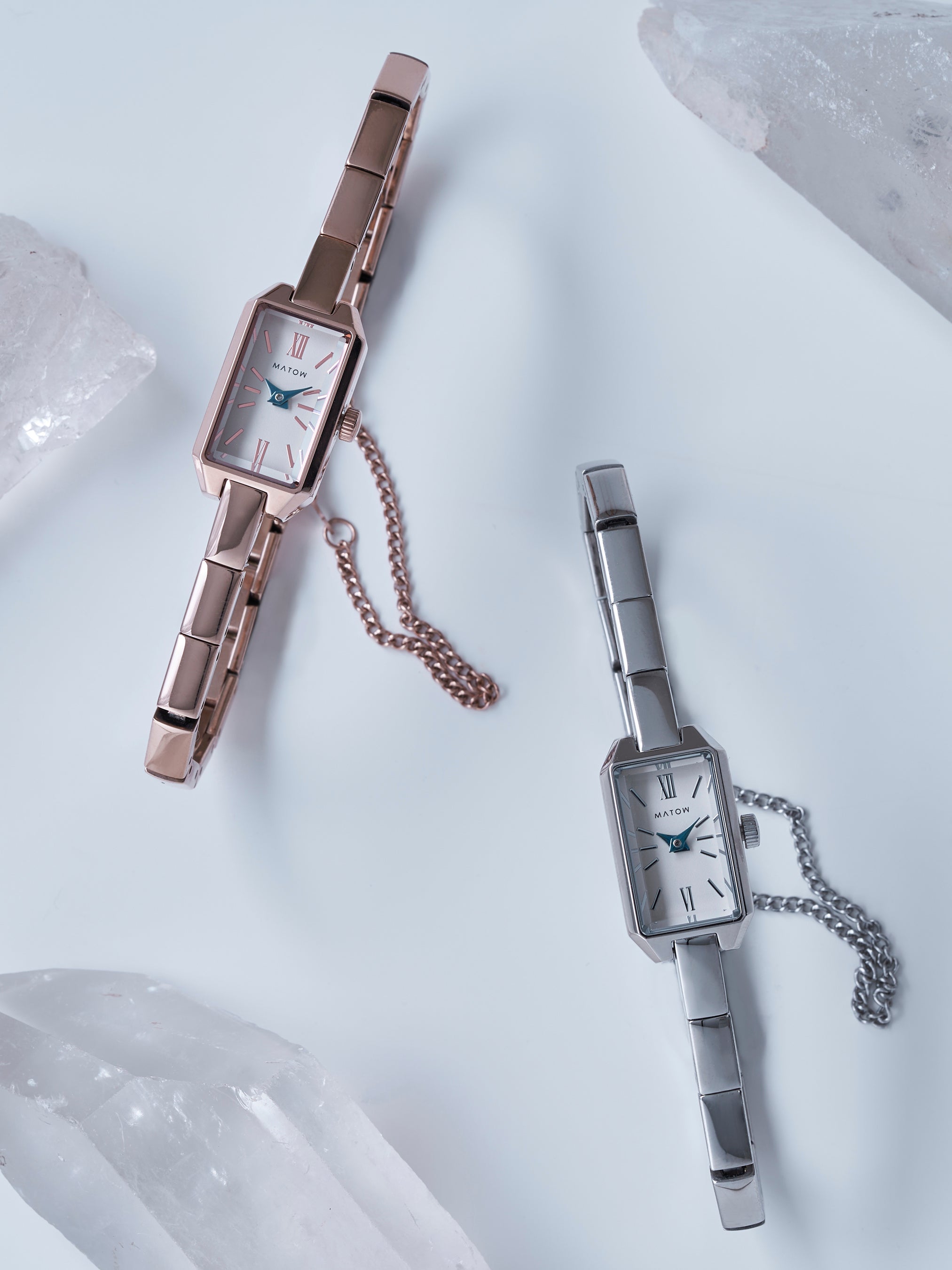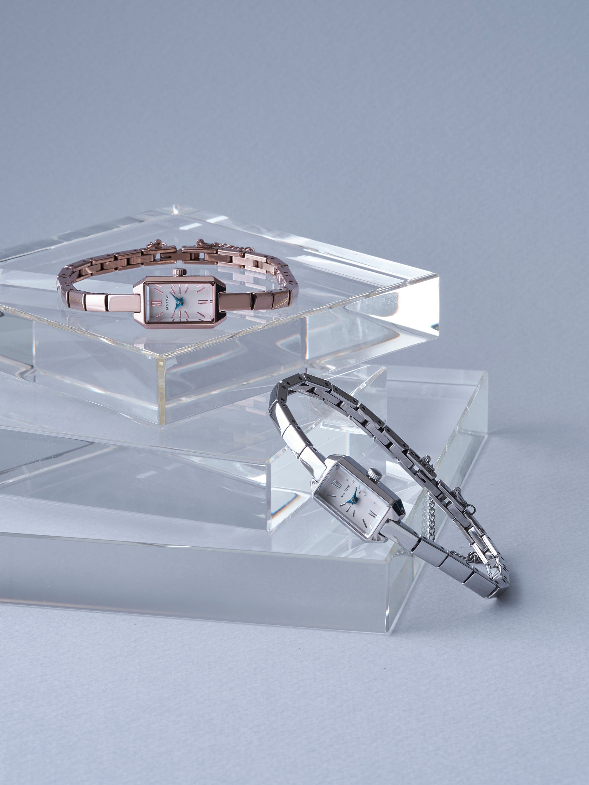 職人の手によって細部まで丁寧に仕上げられ、時代を超えて愛される一本となるように仕立てました。縦23mm×横13mmのコンパクトなレクタングルケースは、ローズゴールドとシルバーの2種類をラインナップ。それぞれケース同色のメタルベルトを備え、手首に馴染むように設計されています。さらに、バックル部分には細身のチェーンが付属し、ジュエリーのように楽しめる仕様に。シンプルながらも、手元に洗練された輝きを添えるデザインとなっています。都会の喧騒から一歩離れ、静かに自分と向き合う時間を持ちたい。そんな大人の女性に寄り添う時計です。オンタイムには端正な品格を添え、オフタイムには優雅なリラックス感を演出します。移ろいゆく時間の美しさを、手元でそっと感じてください。