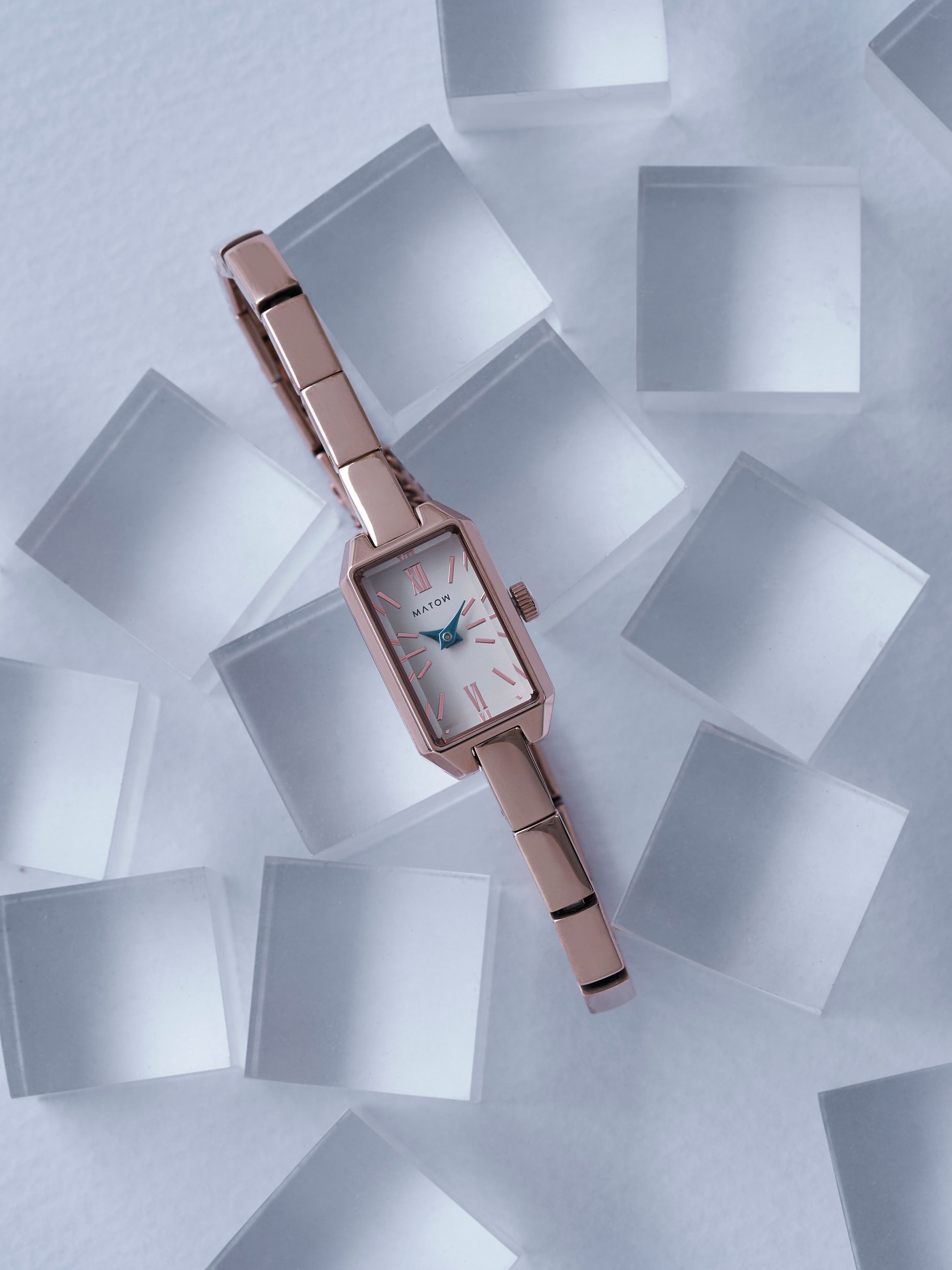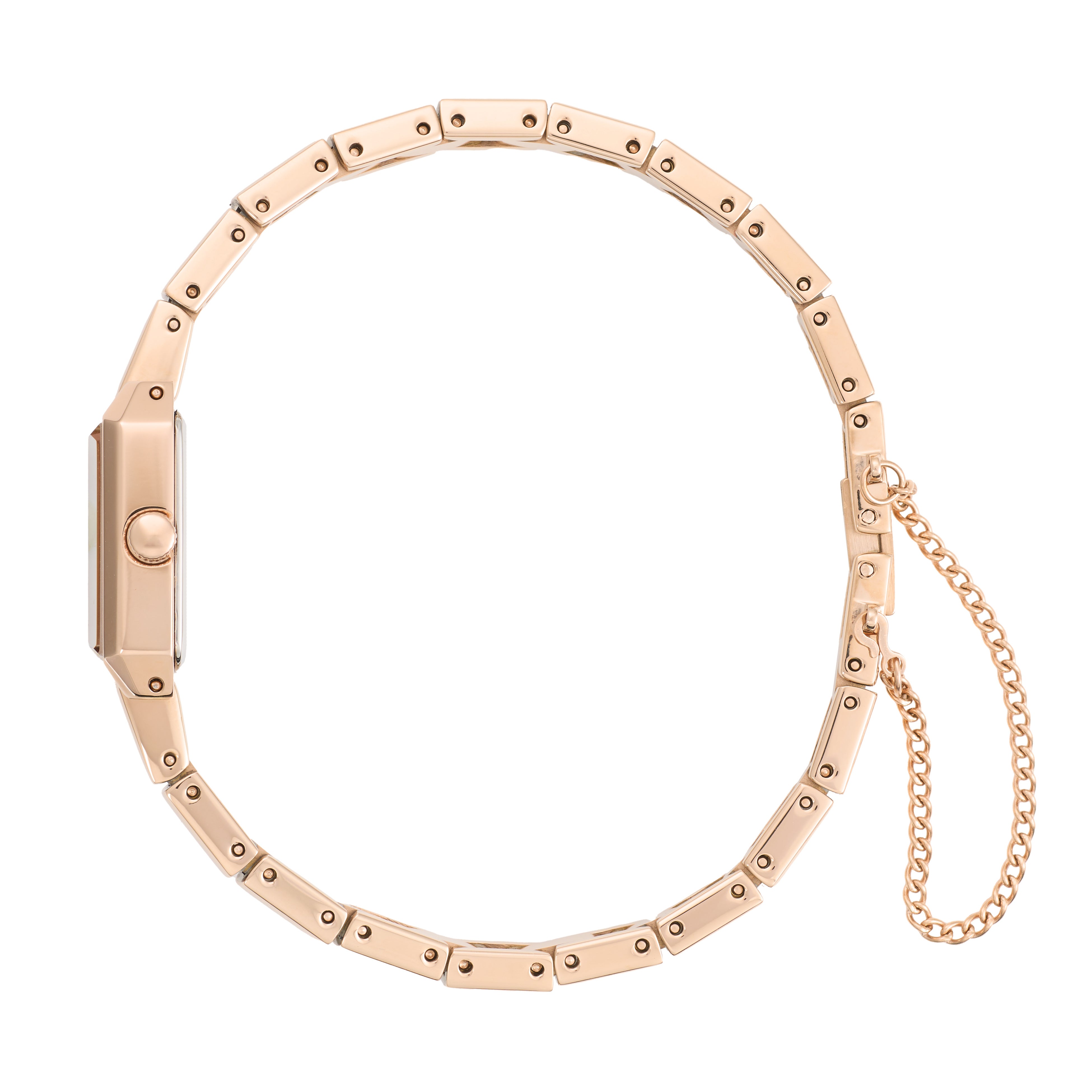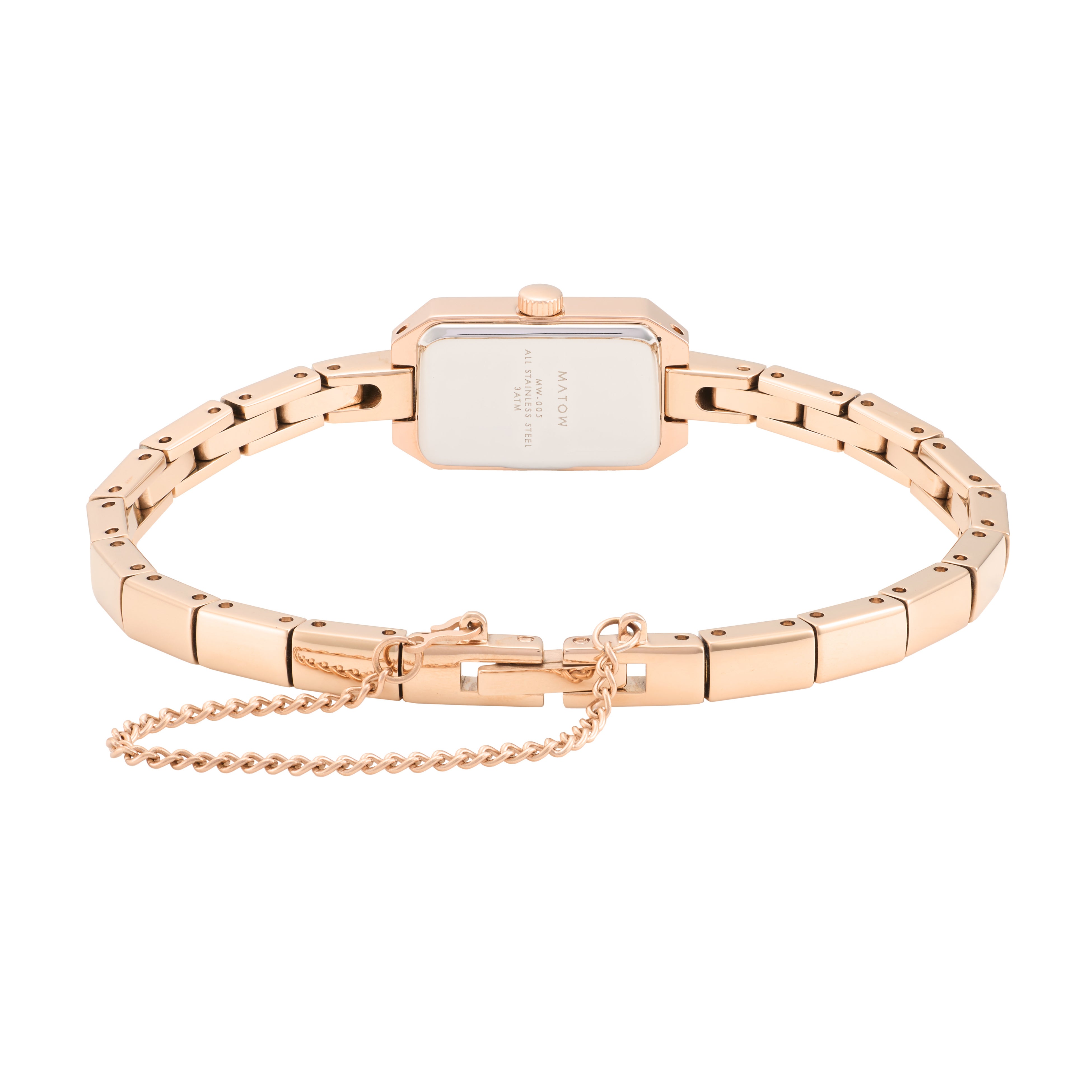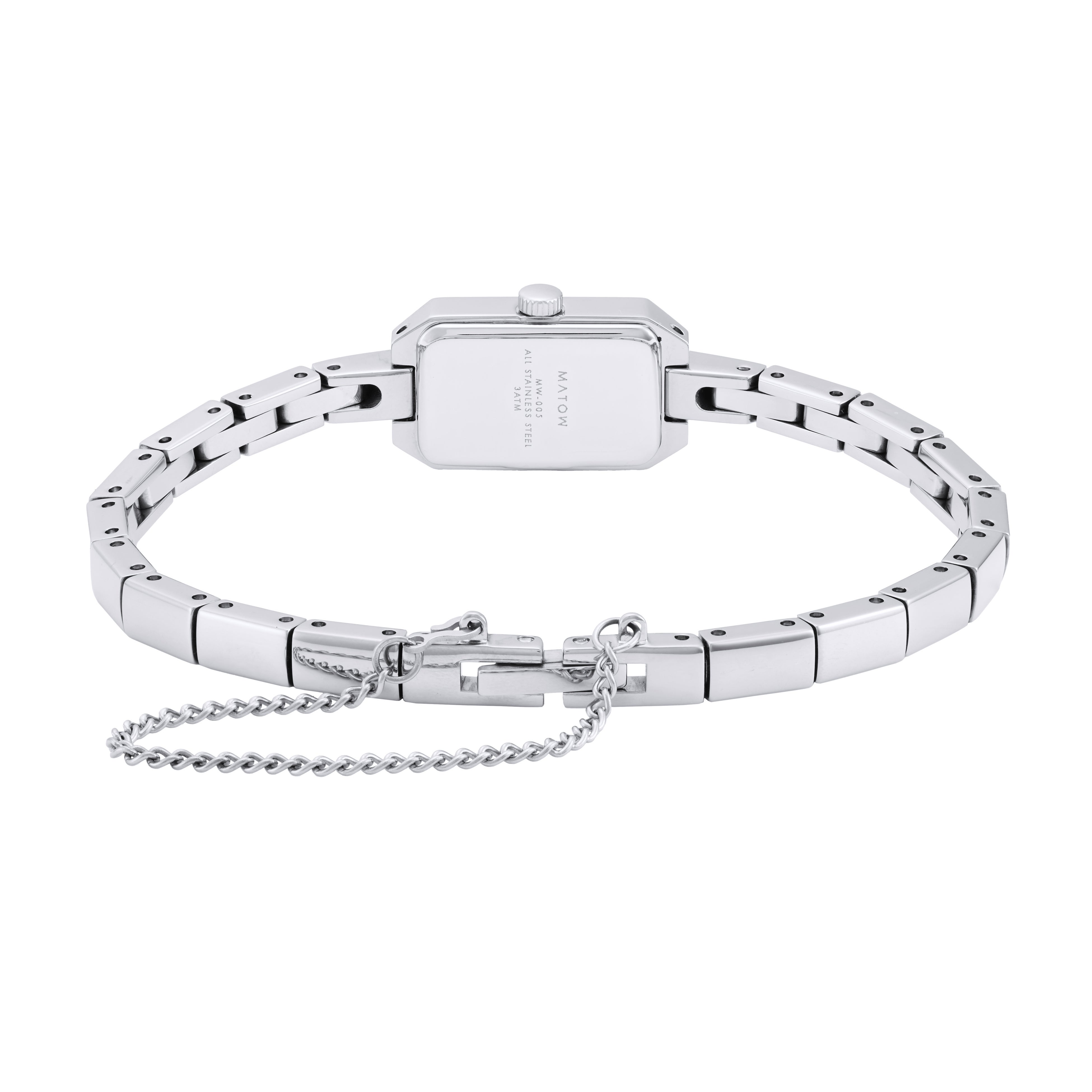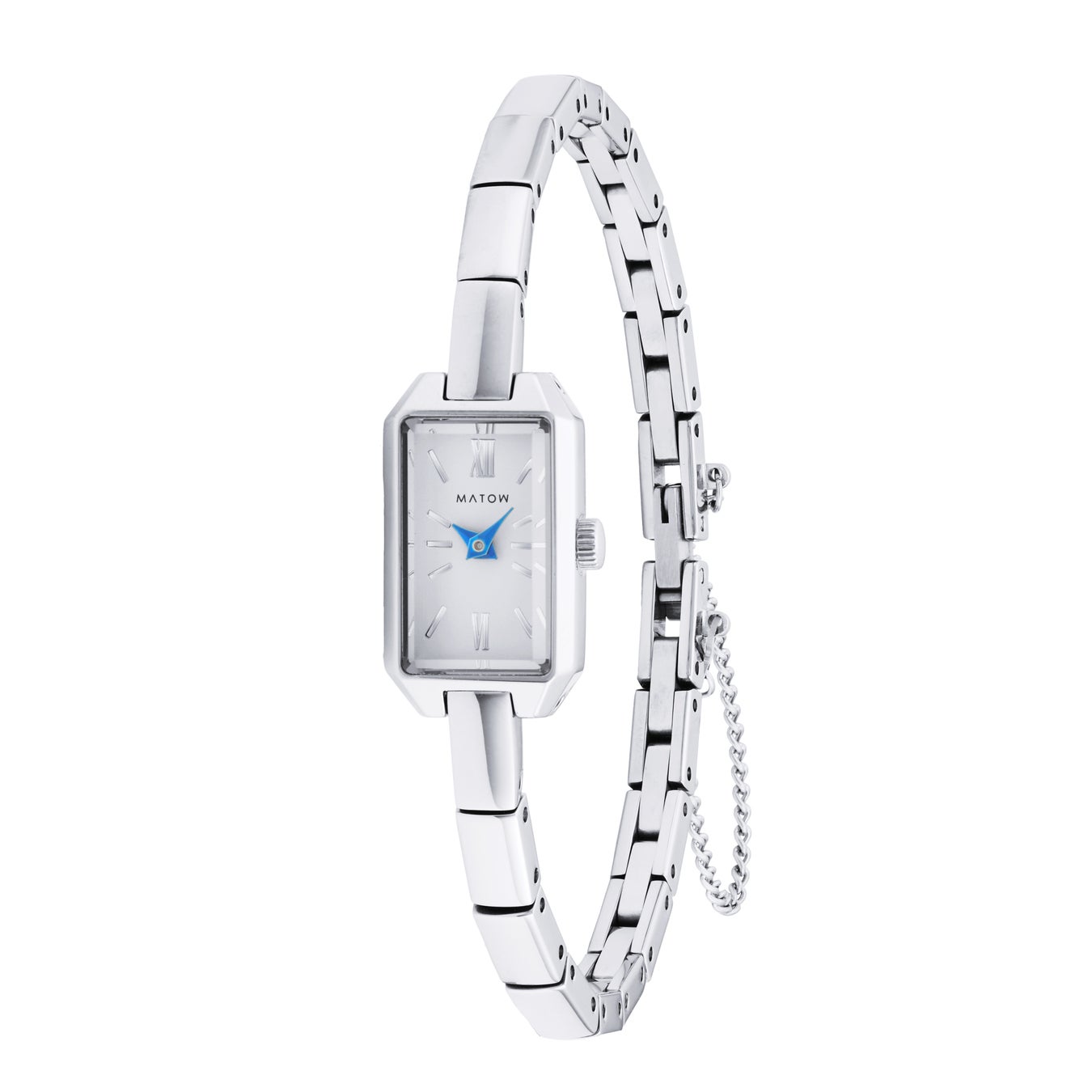 職人の手によって細部まで丁寧に仕上げられ、時代を超えて愛される一本となるように仕立てました。縦23mm×横13mmのコンパクトなレクタングルケースは、ローズゴールドとシルバーの2種類をラインナップ。それぞれケース同色のメタルベルトを備え、手首に馴染むように設計されています。さらに、バックル部分には細身のチェーンが付属し、ジュエリーのように楽しめる仕様に。シンプルながらも、手元に洗練された輝きを添えるデザインとなっています。都会の喧騒から一歩離れ、静かに自分と向き合う時間を持ちたい。そんな大人の女性に寄り添う時計です。オンタイムには端正な品格を添え、オフタイムには優雅なリラックス感を演出します。移ろいゆく時間の美しさを、手元でそっと感じてください。