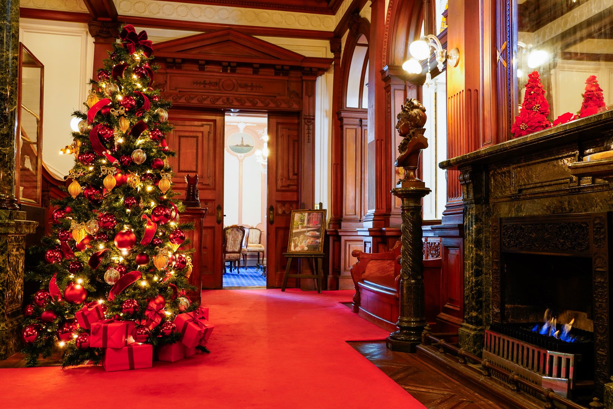11月中旬からは館内外を彩るクリスマス装飾とイルミネーションが始まり、洋館全体がホリデーシーズンの華やぎに包まれます。本館1階の暖炉には炎が灯り、ロビーには赤と金を基調としたツリーを設置。夕刻には、アフタヌーンティー会場「迎賓の間」から、エントランスの大きなヒマラヤ杉がライトアップされる様子もお楽しみいただけます。