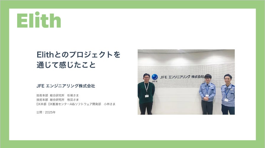 Elithは、JFE エンジニアリング株式会社との伴走支援事例として、技術本部 総合研究所の杉垣様、牧田様、DX本部 DX推進センターAI&ソフトウェア開発部の小林様のインタビュー記事を公開したことをお知らせいたします。