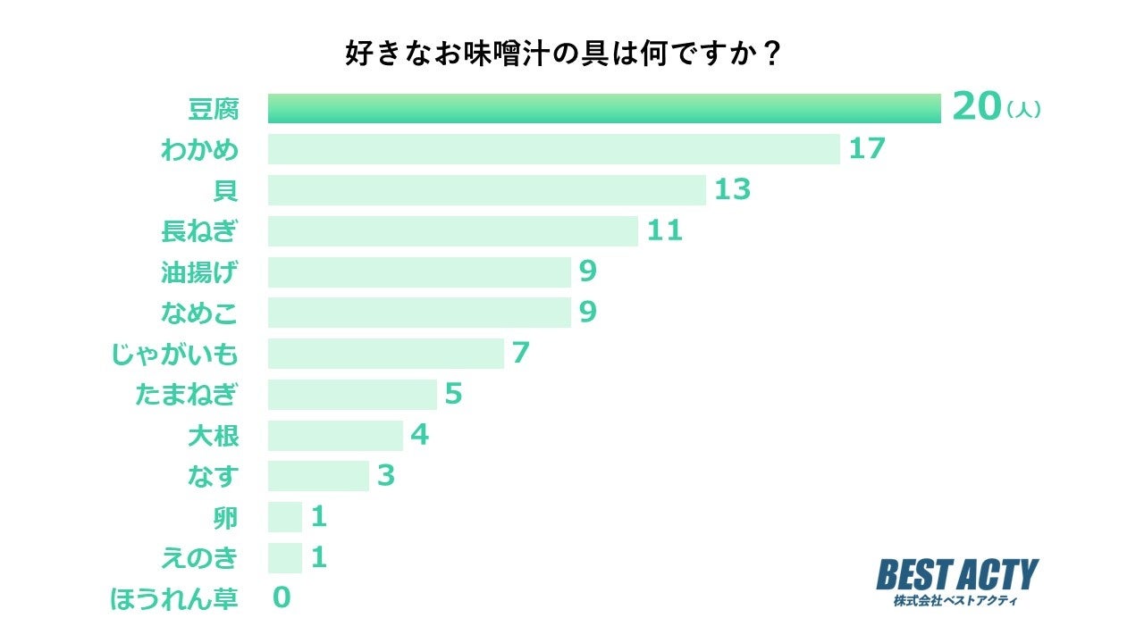 好きなお味噌汁の具について100人にアンケートを行ったところ、「豆腐」と回答する人が最も多い結果となりました。