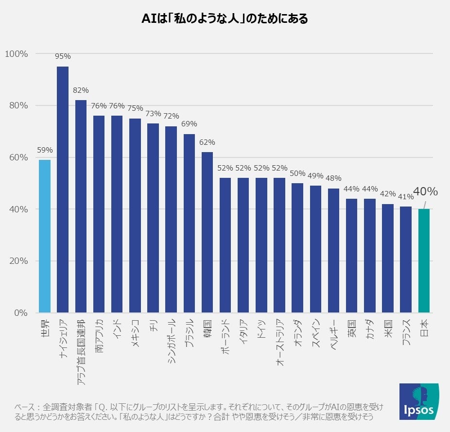 「私のような人がAIの恩恵を受けると思うか」という問いに「恩恵を受けそう」と回答した日本人は40%で、調査対象21ヵ国の中で最下位となりました。この結果は、日本人がAIに対して慎重な姿勢を持っていることを示唆しています。