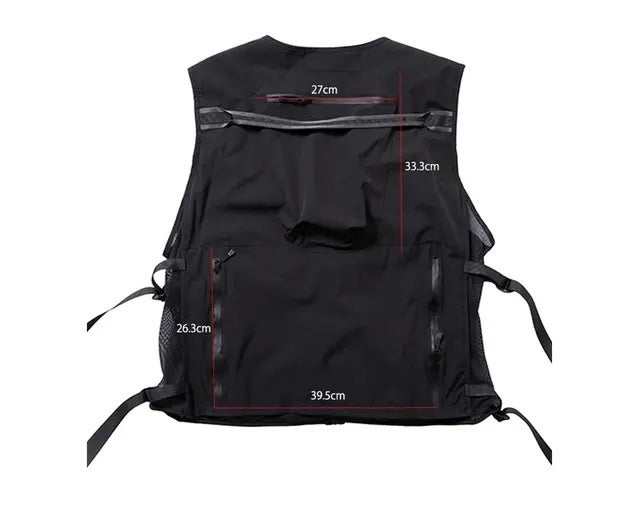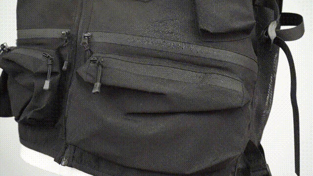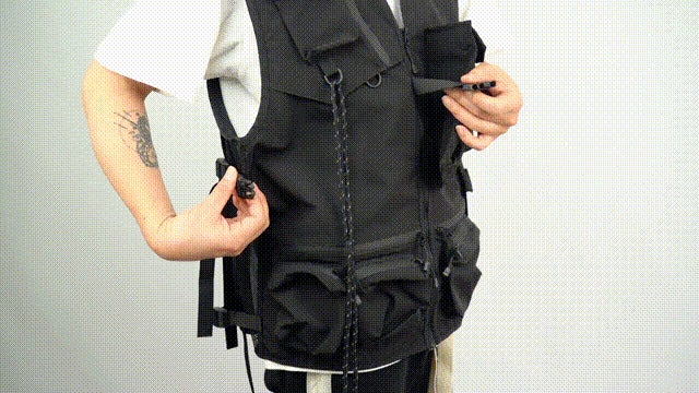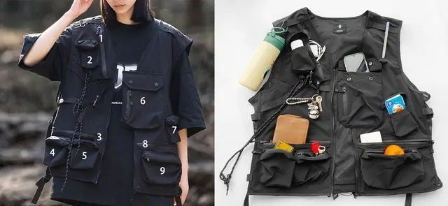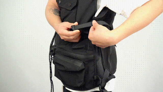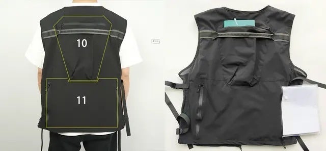 ① かばん要らずの収納力を誇るライトベスト、11個のポケットを搭載し背中にはA4サイズまで収納可能