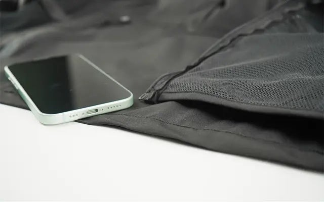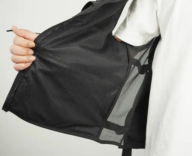 左右両サイドと内側の生地にはメッシュ素材を採用しています。軽くて蒸れにくいので、夏はTシャツの上に、その他の季節はその上にアウターを着用して、収納力のあるインナーベストとしてもご利用いただけます。