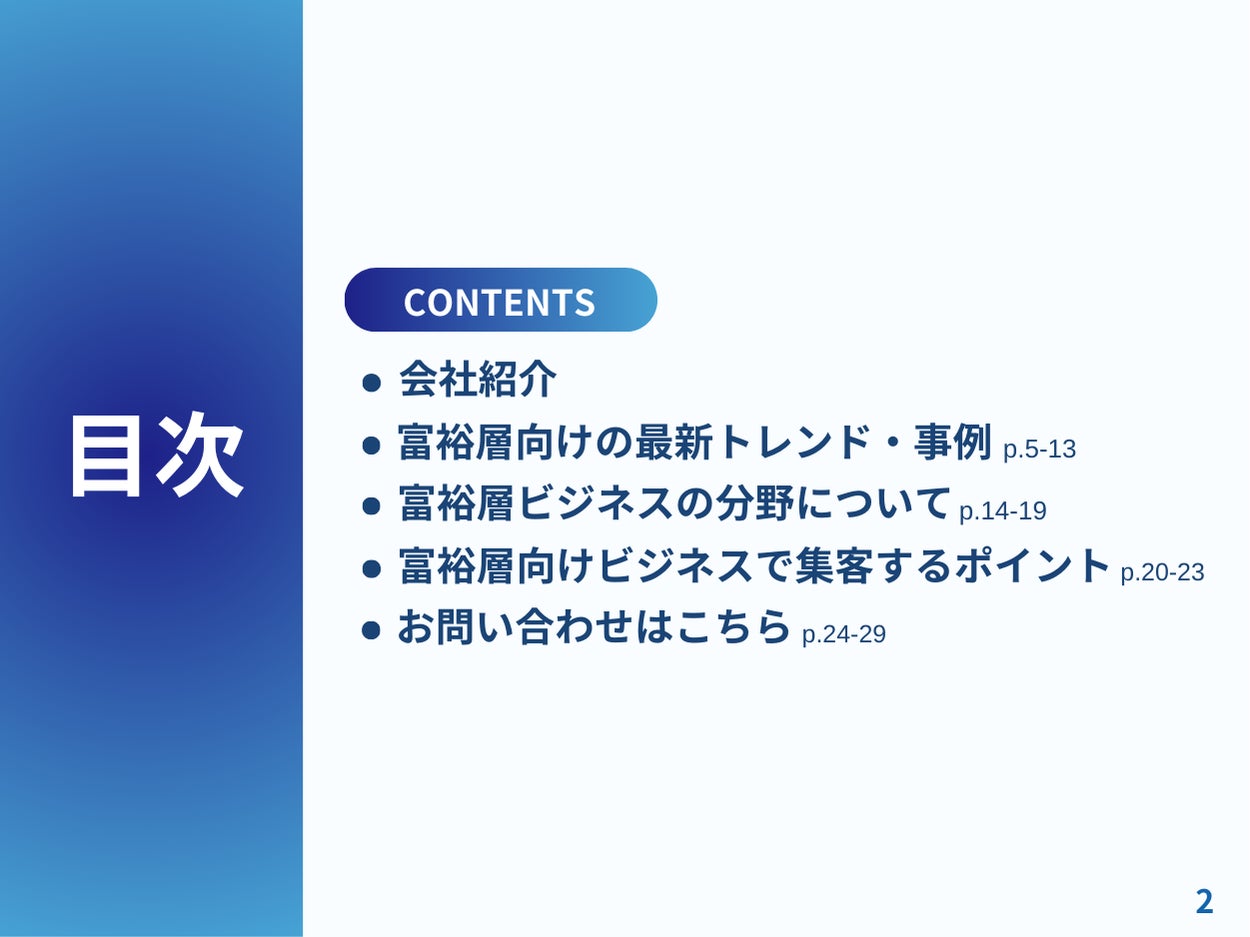 本レポートでは、富裕層マーケティングの理解と購買プロセスにおけるキーとなる要因を解説し、最適なアプローチ手法をご紹介します。本レポートを通じて富裕層の集客に効果的なマーケティング手法や事例を抑え、事業運営の際にご活用ください。