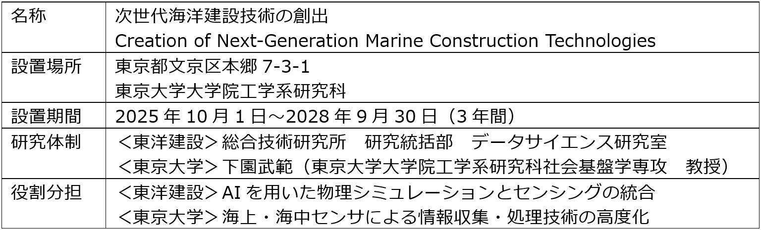 2025年10月1日に、東洋建設株式会社(代表取締役 会長執行役員CEO:吉田真也)と国立大学法人東京大学大学院工学系研究科(研究科長:加藤 泰浩)は、社会連携講座「次世代海洋建設技術の創出」を共同で開設しました。