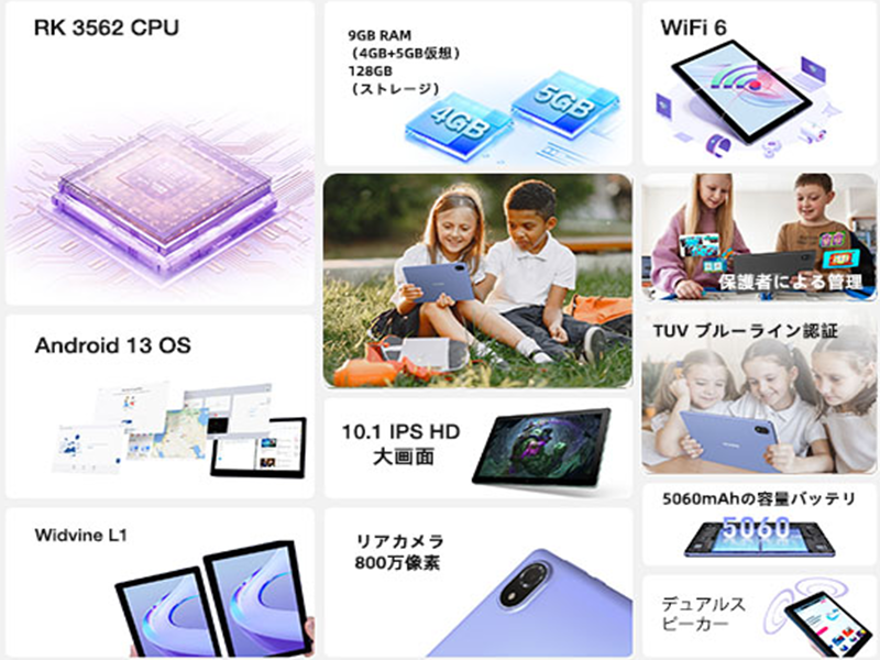 1280 x 800の解像度を持つ10.1インチIPSディスプレイを搭載しており、優れた色再現性と演色性、広い視野角を実現し、作業、動画鑑賞、ゲームに適しています。ディスプレイ性能にも十分配慮しており、ゲームやビデオで素晴らしい視覚体験をお約束します。DOOGEE タブレット10インチ は新世代OSの「Android 13」を搭載し、Android 13 と 12 の違いは、Android 13 は個人のプライバシー保護とセキュリティをアップグレードし、パーソナライズされた機能を強化し、基本的な流暢さを改善し、バッテリーの使用を最適化しました。