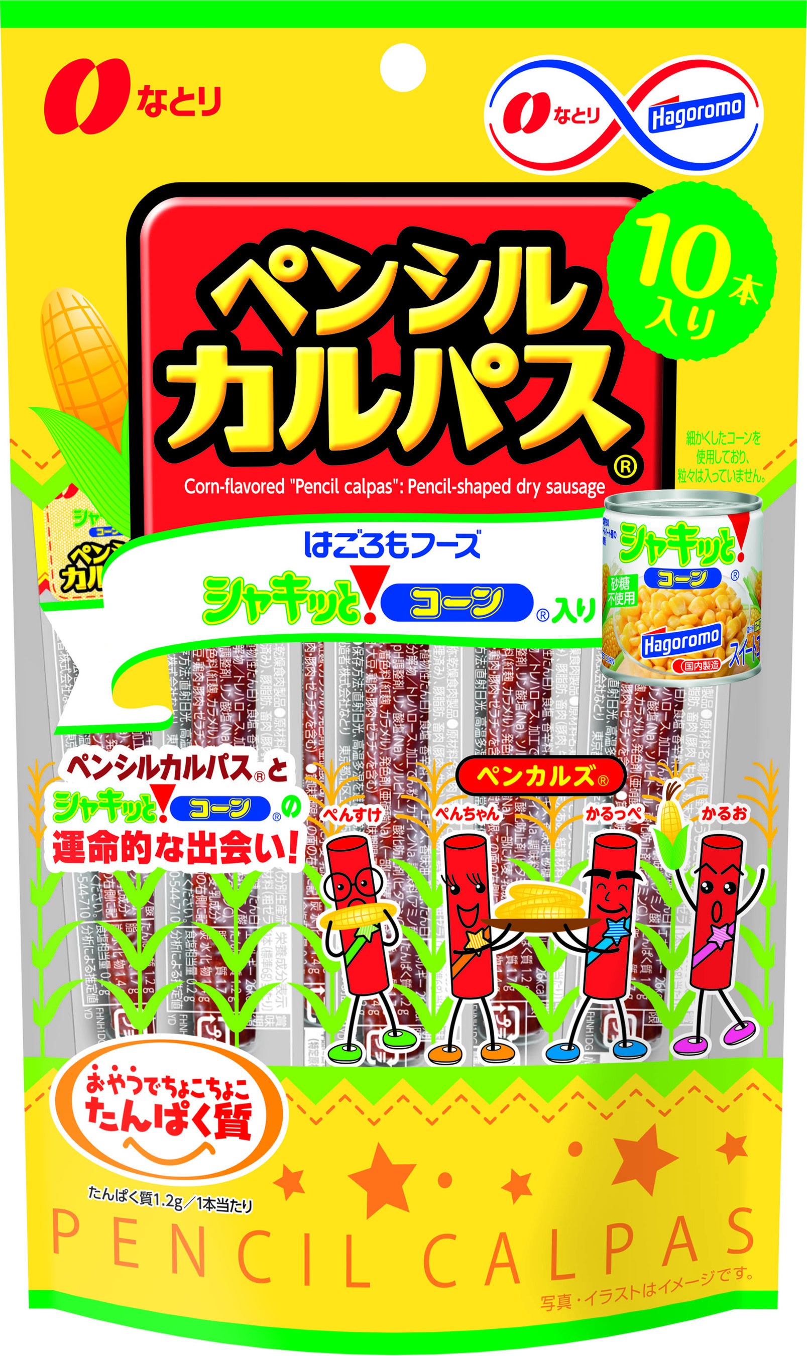 はごろもフーズ㈱の「シャキッと!コーン」を使用し、コーン本来の甘みを活かした味わいに仕上げました。「ペンシルカルパス」の塩味とコーンの甘味のバランスが絶妙な、新しい味わいのカルパスです。