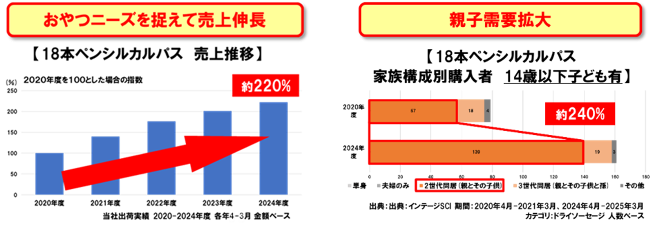 「ペンシルカルパス」は発売以来、幅広いお客様にご好評をいただいています。大人のおつまみとしてだけでなく、「子どもを含む家族みんなのおやつ」として親しまれている点が、好調の要因のひとつです。このたび、更なるおやつ需要の拡大と親子での消費推進を目的に、子どもも大人も楽しめる味わいのバリエーションを展開します。