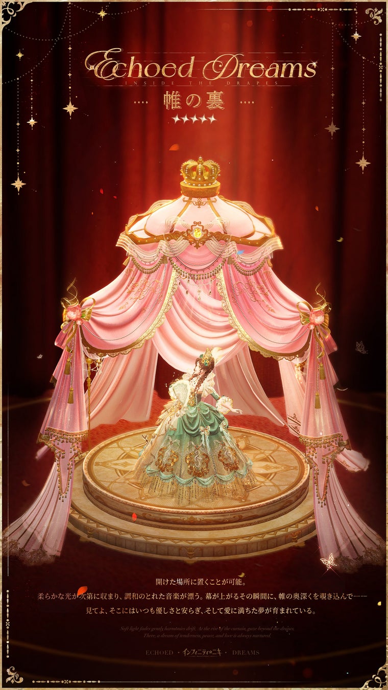 「終幕なき果てに沈む夢」で共鳴を160回行うと、置物【帷の裏】を追加で獲得できます。【帷の裏】は、「ホーム家具」と「置物」のタグを両方とも持っており、ワールドやホームの広い場所に置き、撮影や鑑賞ができます。