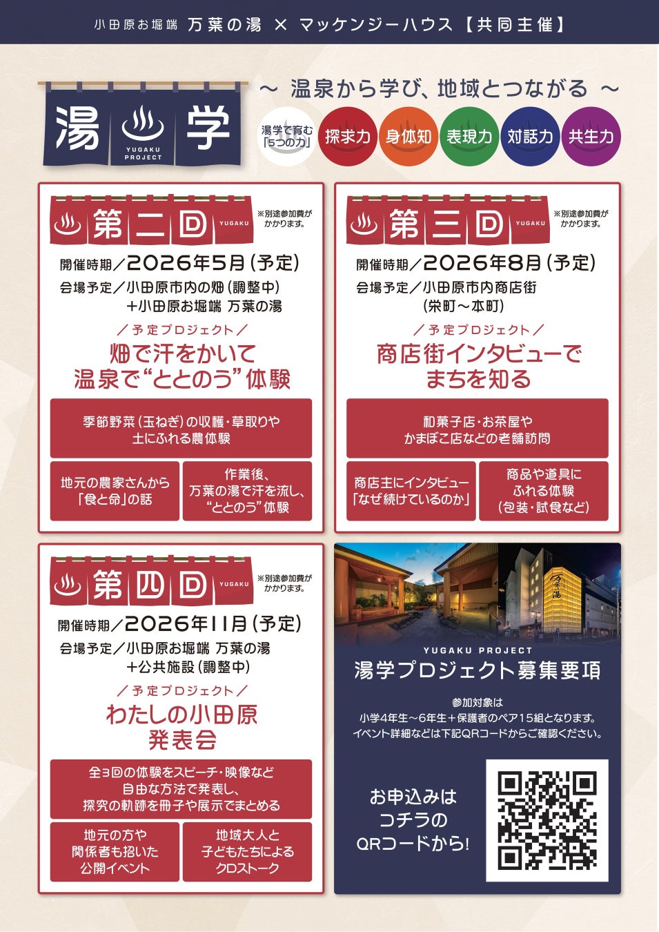 株式会社マッケンジーハウス(神奈川県平塚市)と、小田原お堀端 万葉の湯は、共同主催により、親子で地域を学ぶ探究型教育プログラム「湯学(YUGAKU PROJECT)」 を2026年2月より開始します。