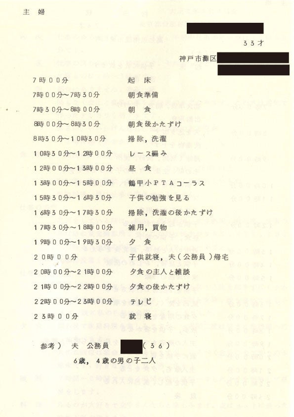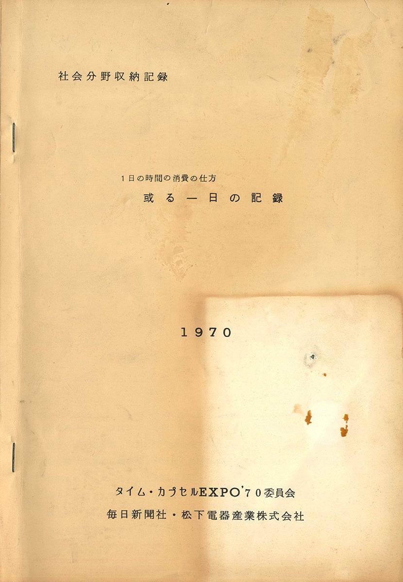 タイム・カプセルEXPO’70委員会が「1日の行動を時間経過に従って記録して下さい」という依頼のもと行動記録の調査を行ない、一般人から有名人、政治家に至る44名のデータをまとめた記録資料です。その多くは個人のルーティンが書き記されており、当時の人々の生活がいきいきと伝わる内容となっています。また一般の成人男性と女性は「サラリーマン」と「主婦」が代表的人物として選ばれているなど、当時の社会通念を知ることができる重要な資料です。
