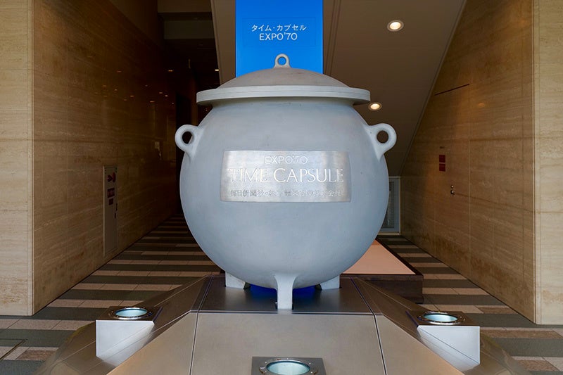 本展示でスポットを当てるタイム・カプセルEXPO’70(以後、カプセル)は昭和45年(1970)に開催された日本万国博覧会を記念して、毎日新聞社と松下電器産業株式会社(現・パナソニック ホールディングス株式会社)によりつくられました。当時の文化を5,000年後の人類に向けて残すためにカプセルは4機製造され、そのうち2機は大阪城公園本丸御殿跡の地下15mに埋設されました。地上用に残された2機のうち、1機をパナソニック ミュージアムに、残り1機を当館の1階にて展示しています。