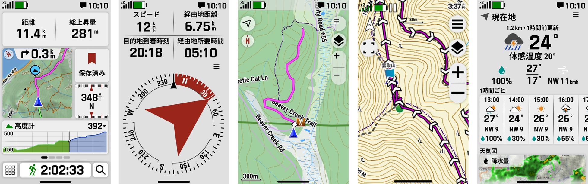 オートルート機能、ライブジオキャッシング、トラックバック、LiveTrack、天気予報・通知など |