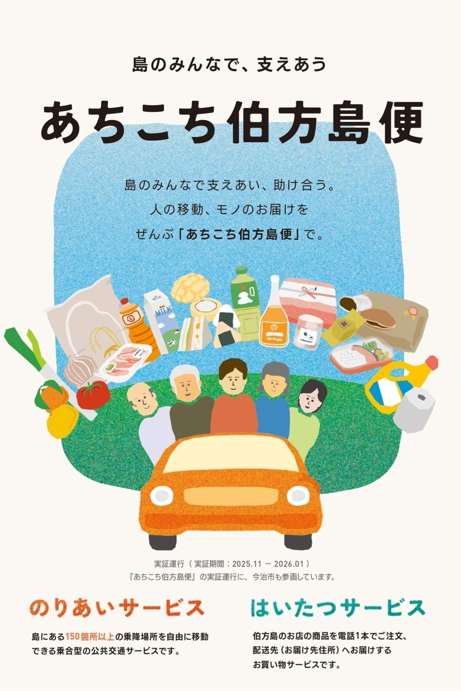 愛媛県今治市(市長:徳永繁樹)と民間企業等で構成する「伯方島モビリティコンソーシアム」は、2025年11月17日から伯方島において公共ライドシェア「あちこち伯方島便」の運行を開始しました。島内約150か所の乗降ポイントを自由に移動できる「のりあいサービス」に加え、12月には地元の小売店舗から商品をお届けする「はいたつサービス」も始まります。島暮らしの“足の確保”と“買い物の負担軽減”を両立し、持続可能な地域交通のモデルづくりを目指す実証実験です。