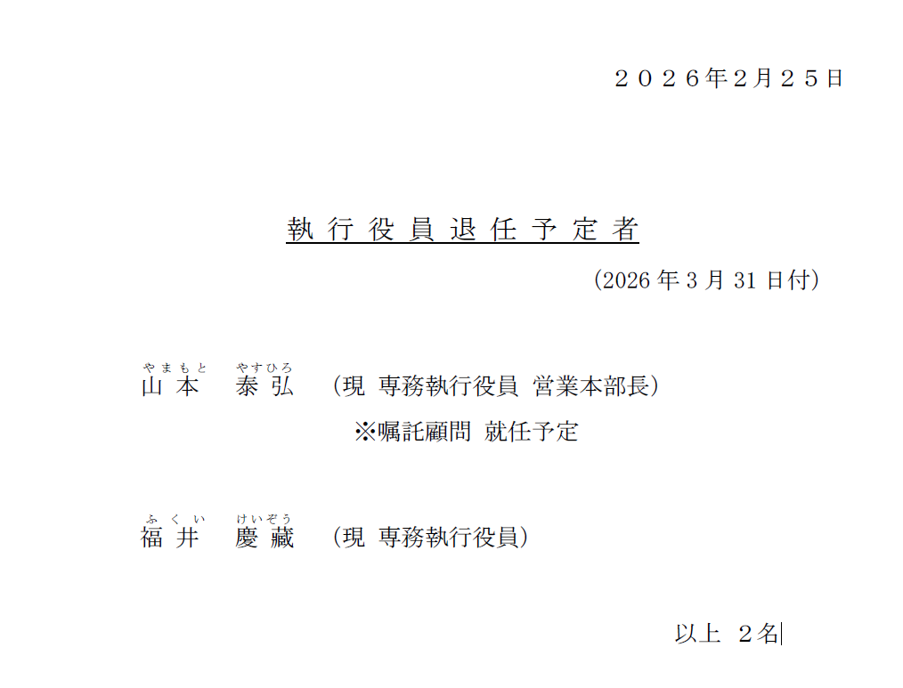 当社は、2026年2月25日開催の取締役会において、下記のとおり、役員人事について決議いたしましたので、お知らせいたします。
