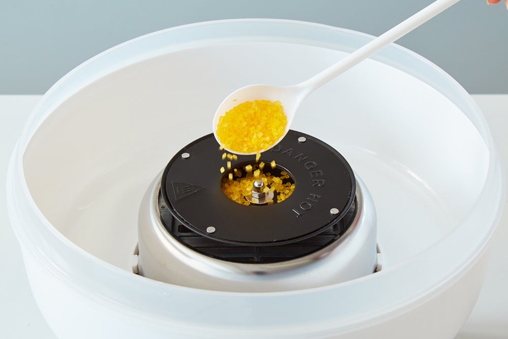 予熱後、付属スプーン1杯分の砂糖を入れてスイッチをONにするだけのシンプル設計。出てきたわたあめをスティックで絡め取るだけで、初心者やお子様でも簡単に屋台のような大きくて丸いわたあめが作れます。