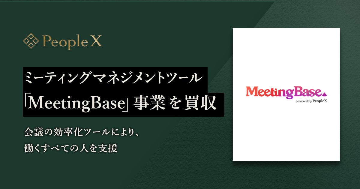 エンプロイーサクセス事業を推進する株式会社PeopleX(本社:東京都新宿区、代表取締役CEO:橘 大地、以下:当社)は、弁護士ドットコム株式会社(東京本社:東京都港区、代表取締役社長兼CEO:元榮 太一郎)が運営を行ってきた「MeetingBase」(以下:本サービス)の事業につき、同社と事業譲渡契約を締結し、2025年3月1日付で譲受が完了したことをお知らせします。