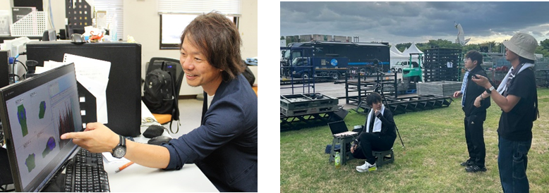 吉田教授は2023年にFM802と「オトヂカラプロジェクト」を発足させ、アーティストや聴衆が大音量の音を会場で楽しめ、なおかつ住民の環境も守る「適切な音」を探りたいと、万博記念公園で開催する野外フェスの音について調査研究するようになりました。フェス当日にステージから100m間隔で音の大きさや高さを計測し、スピーカーの種類や設置場所、楽曲の周波数特性による影響などを調べています。会場内外での音の伝わり方や適切な音響レベルの上限値を見いだすことから、多くの野外フェス会場での音響設定への活用を目指しています。
