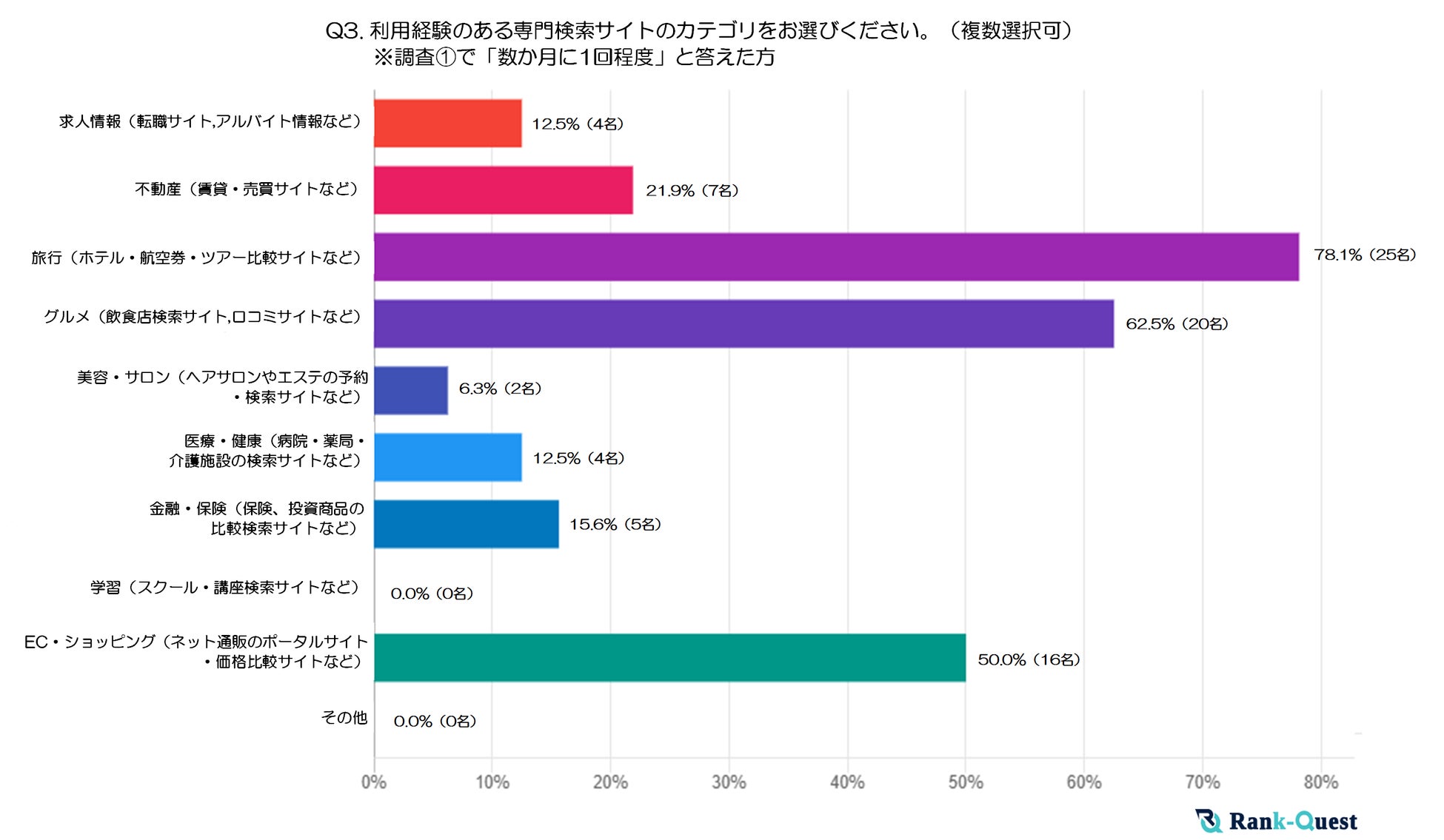 最も多かった回答は「旅行(ホテル・航空券・ツアー比較サイトなど)」で78.1%、次いで「グルメ(飲食店検索サイト・口コミサイトなど)」が62.5%、「EC・ショッピング(ネット通販ポータル・価格比較サイトなど)」が50%でした。
