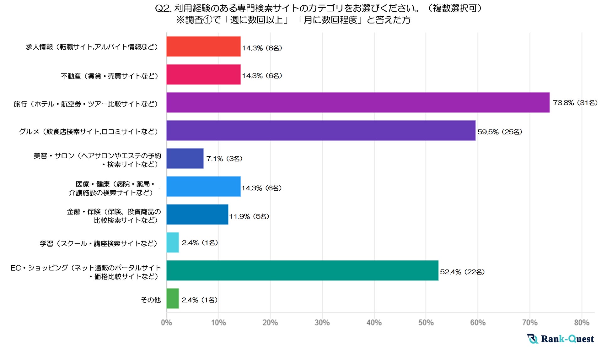 最も多かった回答は「旅行(ホテル・航空券・ツアー比較サイトなど)」で73.8%、次いで「グルメ(飲食店検索サイト、口コミサイトなど)」が59.5%、「EC・ショッピング(ネット通販のポータルサイト・価格比較サイトなど)」が、52.4%でした。