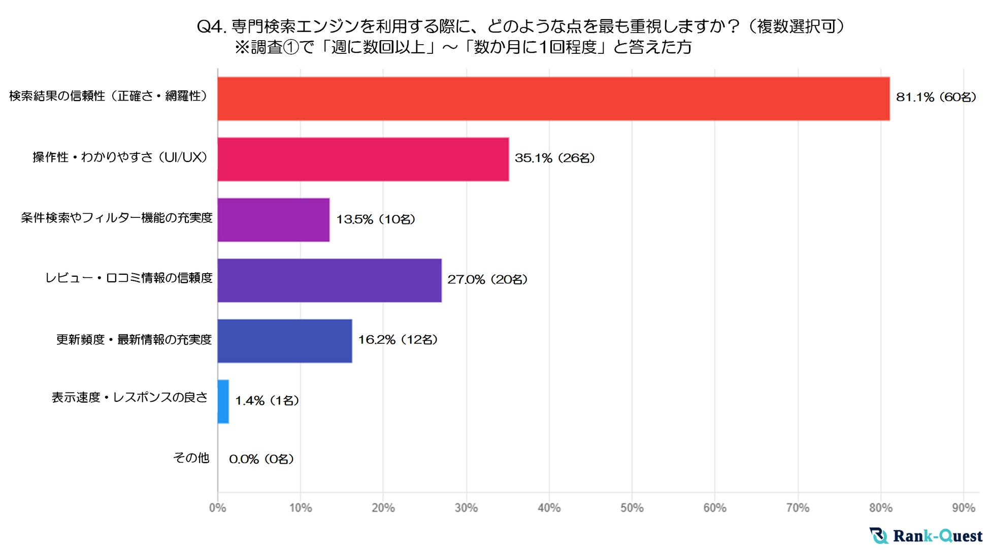最も多かった回答は「検索結果の信頼性(正確さ・網羅性)」で81.1%、次いで「操作性・わかりやすさ(UI/UX)」が35.1%、「レビュー・口コミ情報の信頼度」は27%、「更新頻度・最新情報の充実度」は16.2%となりました。