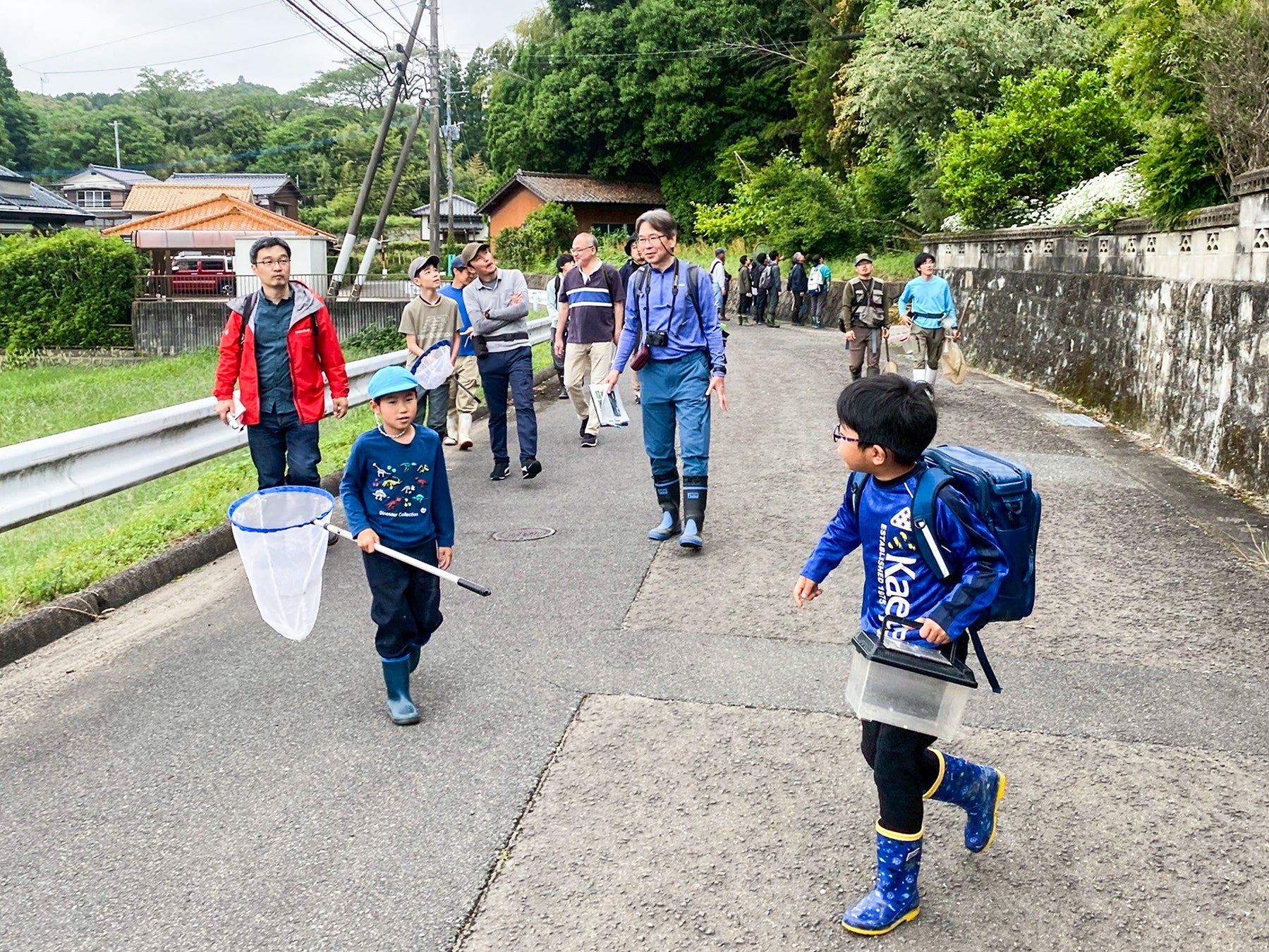 5月18日には、佐賀県自然史研究会と共催で「春の自然観察会」を開催しました。佐賀大学・徳田教授をはじめとする専門家や教員、地域住民、子どもたちが参加し、田んぼ、ため池、森、神社、水路など多様な環境を巡りながら、アカハライモリやカエル類など、さまざまな里山の生きものたちとの出会いを楽しみました。