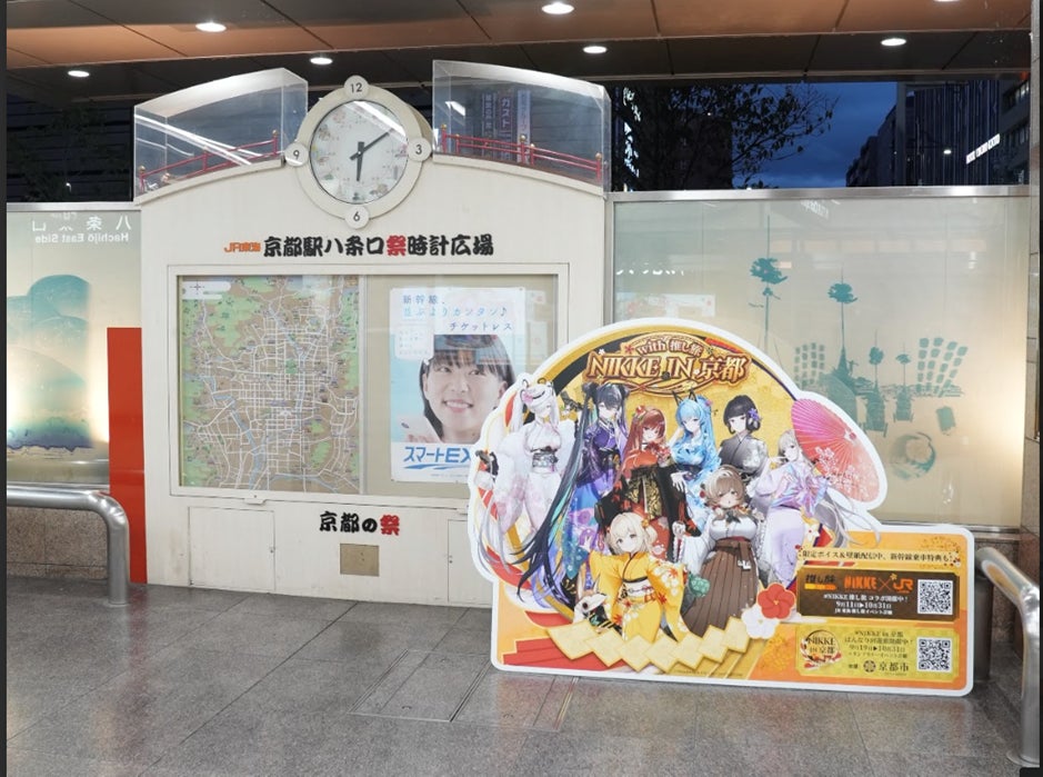 JR東海との特別コラボ「NIKKE in 京都 with 推し旅」では、東海道新幹線の車内にてキャラクターによる特別ボイスを聴くことができ、まるでニケと共に旅をしているかのような臨場感を演出。乗車した方には限定デザインのきっぷ風カードが配布され、コレクションアイテムとしても大きな反響を呼びました。さらに京都駅祭時計広場には記念フォトブースが設置され、和装姿のキャラクターたちと並んで撮影する参加者の姿で賑わい、旅の思い出を残す特別なスポットとして多くのファンに親しまれています。