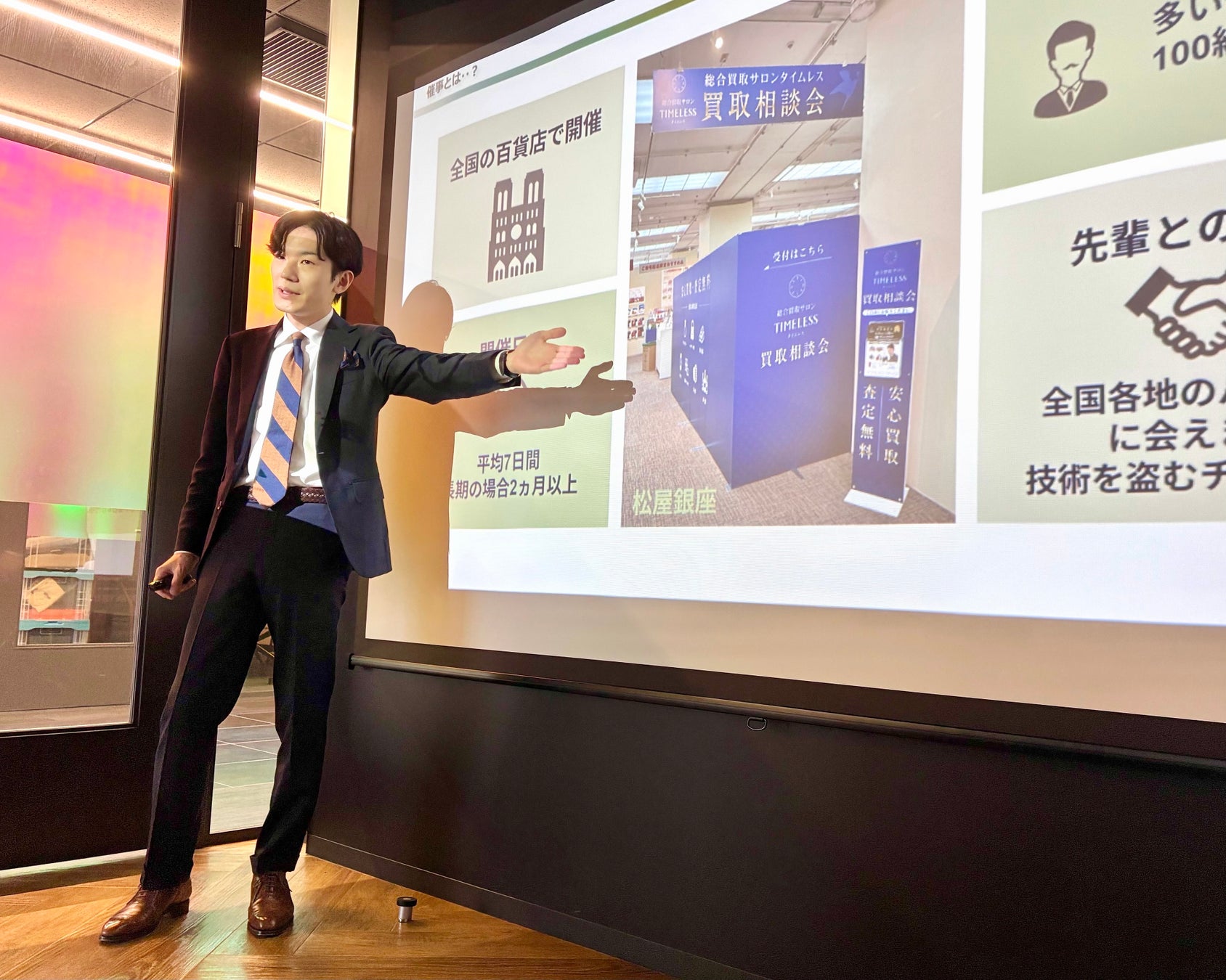 株式会社タイムレスは2025年4月20日(日) 25:25〜放送開始のフジテレビ『タイムレスマン』にて紹介されました。株式会社タイムレスのメインオフィスである豊洲オフィスにtimeleszメンバーの8人にお越しいただき、撮影が行われました。timeleszメンバーが「先輩にご挨拶」をすることになり、株式会社タイムレス社員とtimeleszメンバー全員にサプライズで撮影が始まりました。弊社会社紹介のあと、代表取締役社長の馬場からも「一緒にタイムレスを盛り上げたい」といった言葉があり、timeleszメンバーからも「ありがたい」といった反応もありました。その後は弊社が査定した想定金額を基に「timeleszオークションプロジェクト」企画が実施されました。総合買取サロンタイムレスの店舗を運営する、店舗営業部部長の岡根を中心にtimeleszメンバーのお品物を査定し、協力させていただきました。
