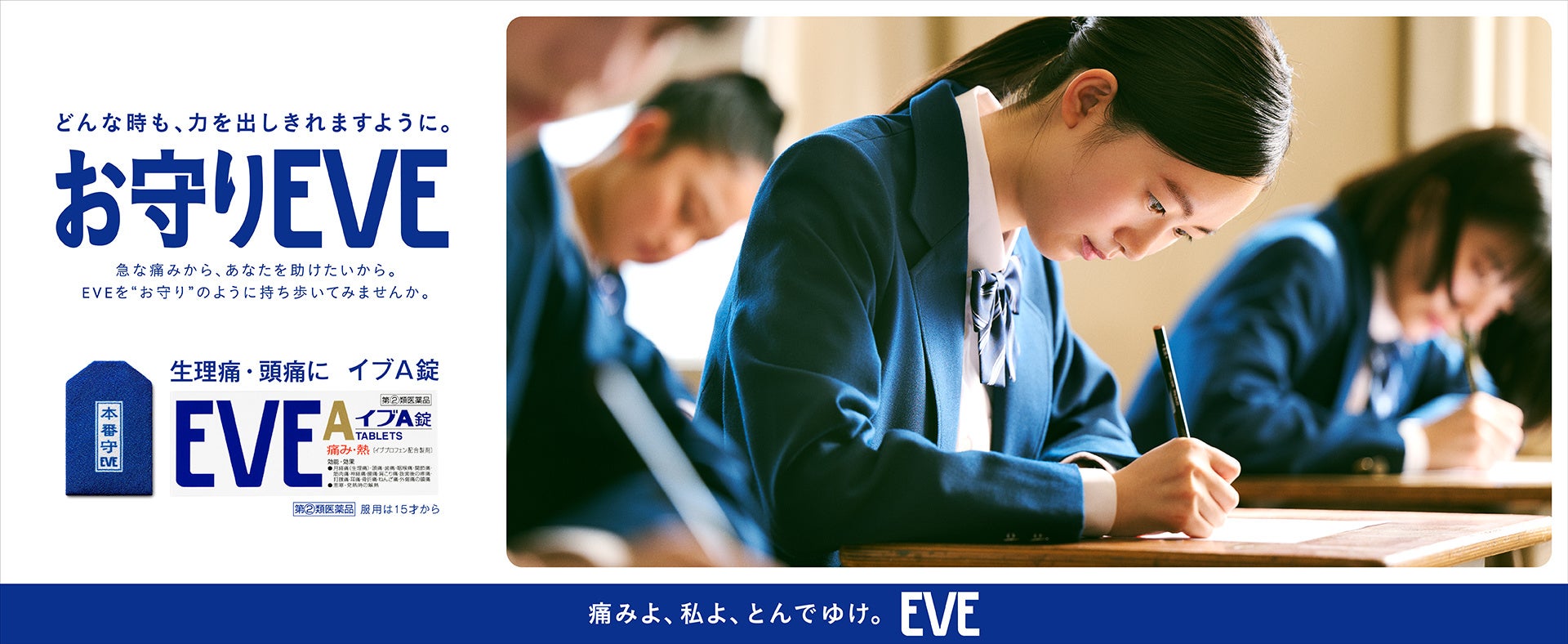 EVE(イブ)は、夢に向かって努力するすべての人が、大切な場面で本来の力を発揮できるよう応援したいという想いから『お守りEVE』キャンペーンを展開しています。受験本番は緊張や不安で体調を崩しやすく、頭痛や生理痛に悩まされることもあるかもしれません。そんな時に備えて、イブA錠を“お守り”のように常備していただければ、心強い存在になるはずです。今回公開する『受験のイブ必勝法』とともに、これまで積み重ねてきた努力を信じて、自分らしく試験に臨めるよう、EVEは皆さんを応援しています。