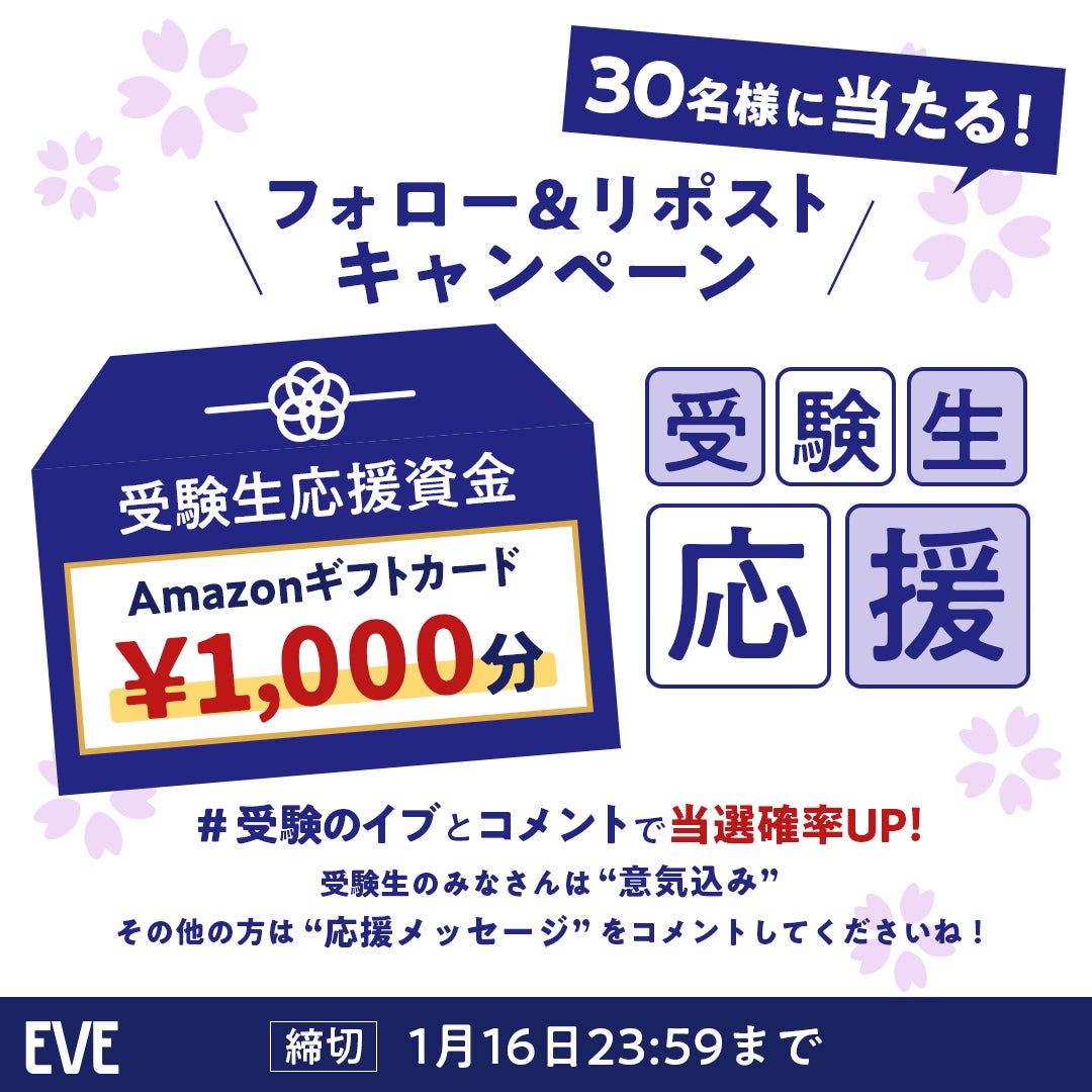 「受験のイブ 必勝法」の公開に合わせ、『EVE(イブ)』の公式X(@EVE_SSP_JP)にて、受験生応援資金としてAmazonギフトカード1,000円分が30名様にあたるキャンペーンを実施いたします。2026年1月8日(木)17時から1月16日(金)23時59分までの期間に、公式Xをフォロー&キャンペーン投稿をリポストしてご参加ください。受験生は受験への意気込み、それ以外の方は受験生に向けたエールを指定ハッシュタグ「#受験のイブ」とともにコメントすると当選確率がアップします。