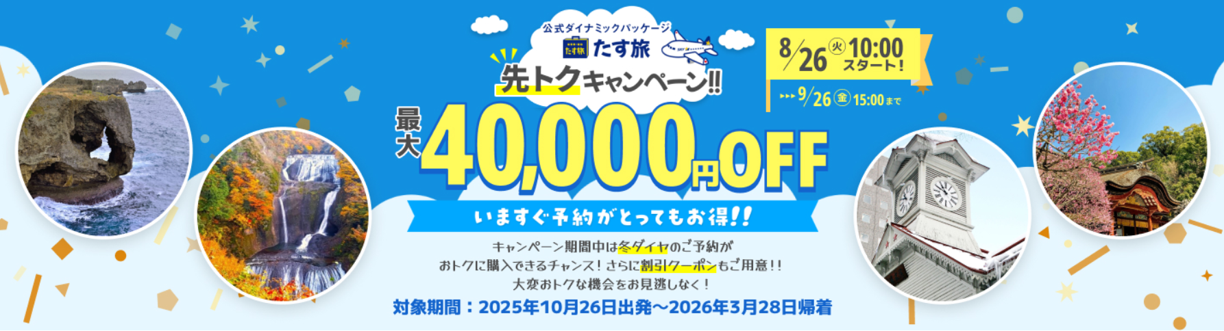 スカイパックツアーズ株式会社(本社:東京都中央区、社長:横山正巳)は、スカイマークの航空券とホテルがセットになった旅行商品(ダイナミックパッケージ)『たす旅』の2026年3月29日(日)出発~2026年10月24日(土)帰着分の販売を本日・1月27日(火)に開始しました。
