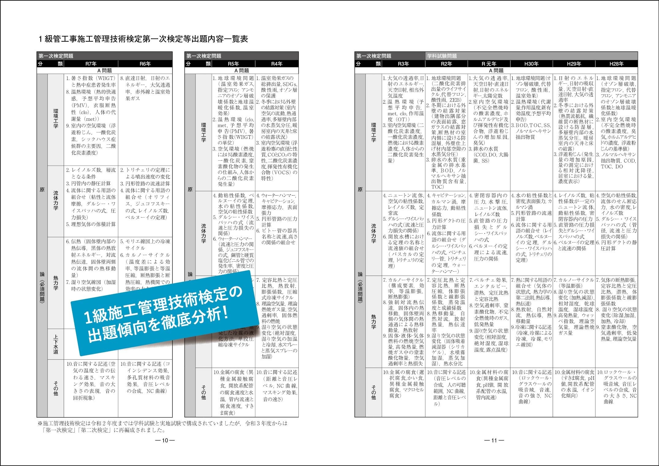また、1級管工事施工管理技術検定では、過去に出題された問題と類似の問題が出題されたり、正答肢を入れ替えて再度出題されたりするケースがよくあります。本書では過去の出題内容を一覧にまとめていますので、出題傾向を把握し、苦手な分野などを徹底的に対策することが効果的です。