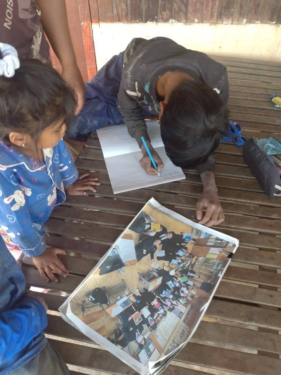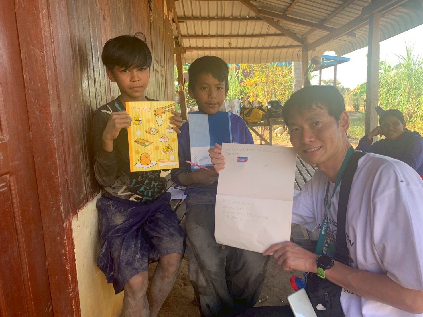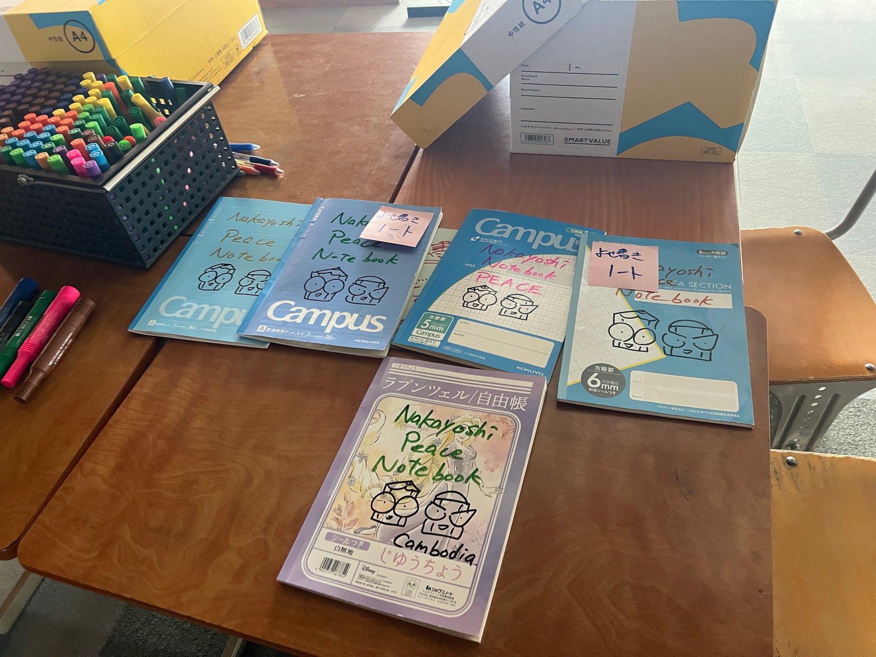 集められた文房具は「なかよしノート」として再編集され、裏表紙に生徒のメッセージやイラストが描かれた“思わず使いたくなるノート”として、カンボジアの難民の子どもたちへ手渡されました。遊佐中生徒の中にはクメール語を学び、クメール語で想いを表現した生徒もおり、現地の子どもたちからは笑顔がこぼれました。