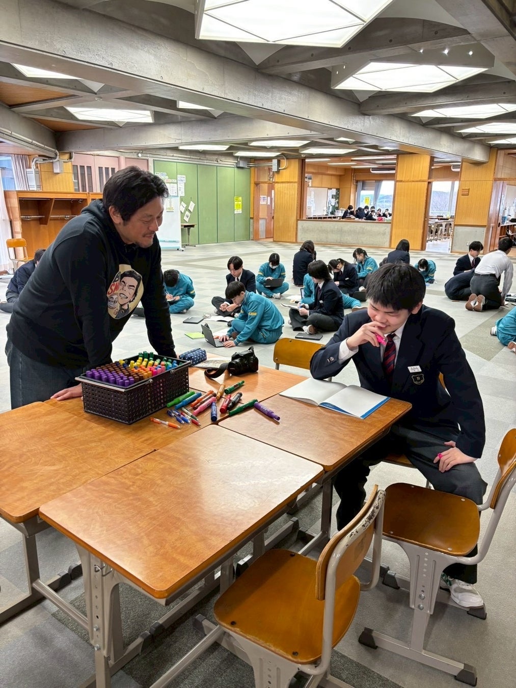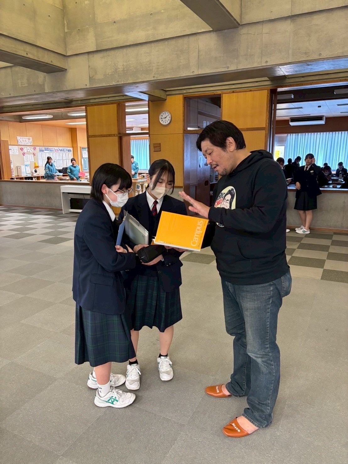 本取り組みは、2025年5月の講演会をきっかけに「今、自分にできること」を考え始めた2年3組が、自主的に文房具回収と募金活動を展開し、2025年12月にカンボジアの難民キャンプでの教育支援(教材を用いた授業)を実現したものです。さらに本講演会では、現地での活用状況を映像・写真で“Return(里帰り)”し、生徒が“Reflect(振り返り)”を行い、次の“Redesign(再設計)”として、遊佐中発の「なかよしノート」「PEACEノート」を新たに制作。国境を越えた学びの循環(CoRe Loop)を、学校全体へ広げました。