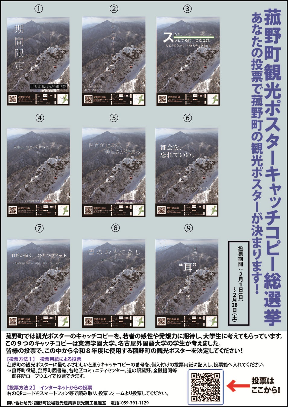 菰野町は、令和8年度の観光PRポスターに使用するキャッチコピーを決定するため、「菰野町観光ポスターキャッチコピー総選挙」を実施しています。町民や一般の方々の投票で最優秀作品が選ばれます。