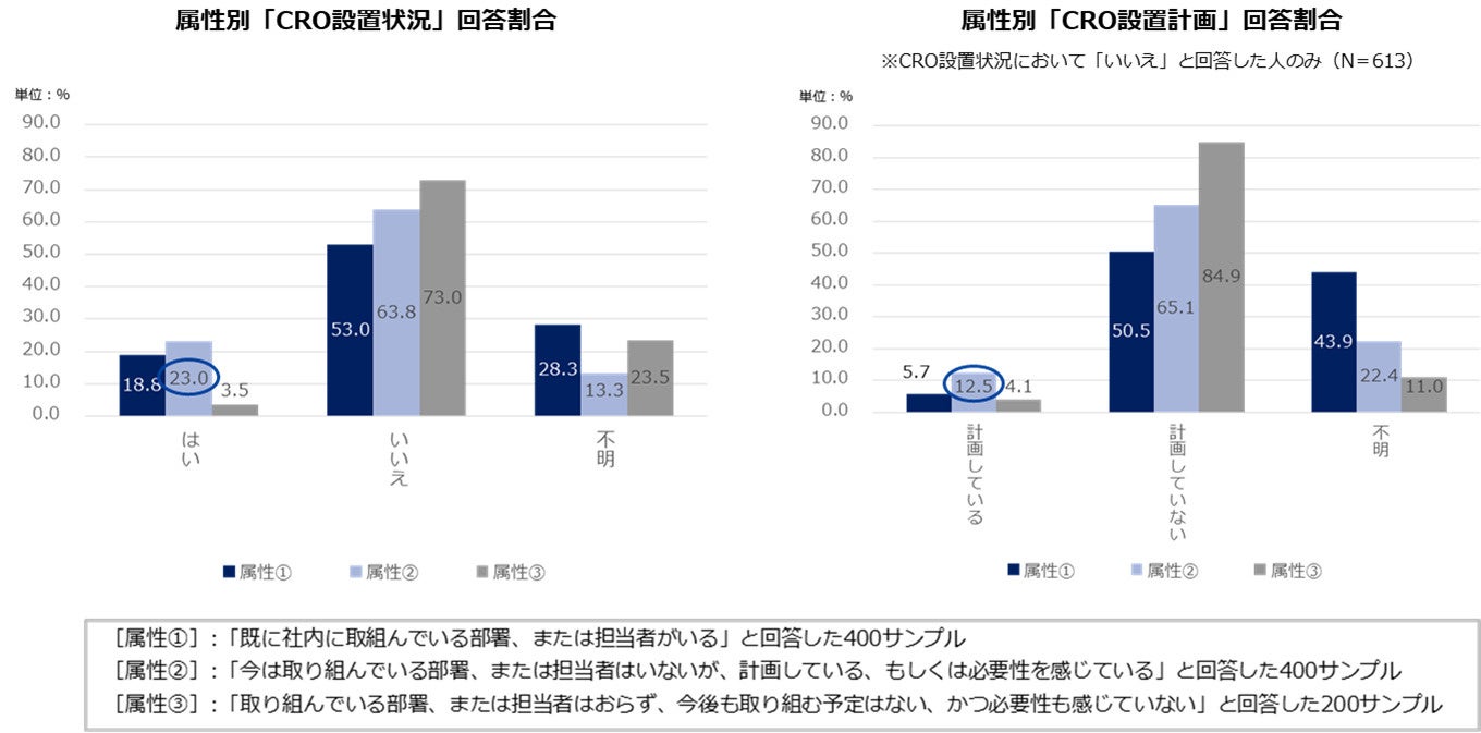CRO設置及び計画状況については、「設置している=はい」と「計画している」の回答割合がいずれも低い結果となりました。日本企業におけるCROの設置についてはまだあまり重要視されていない状況であると見受けられます。