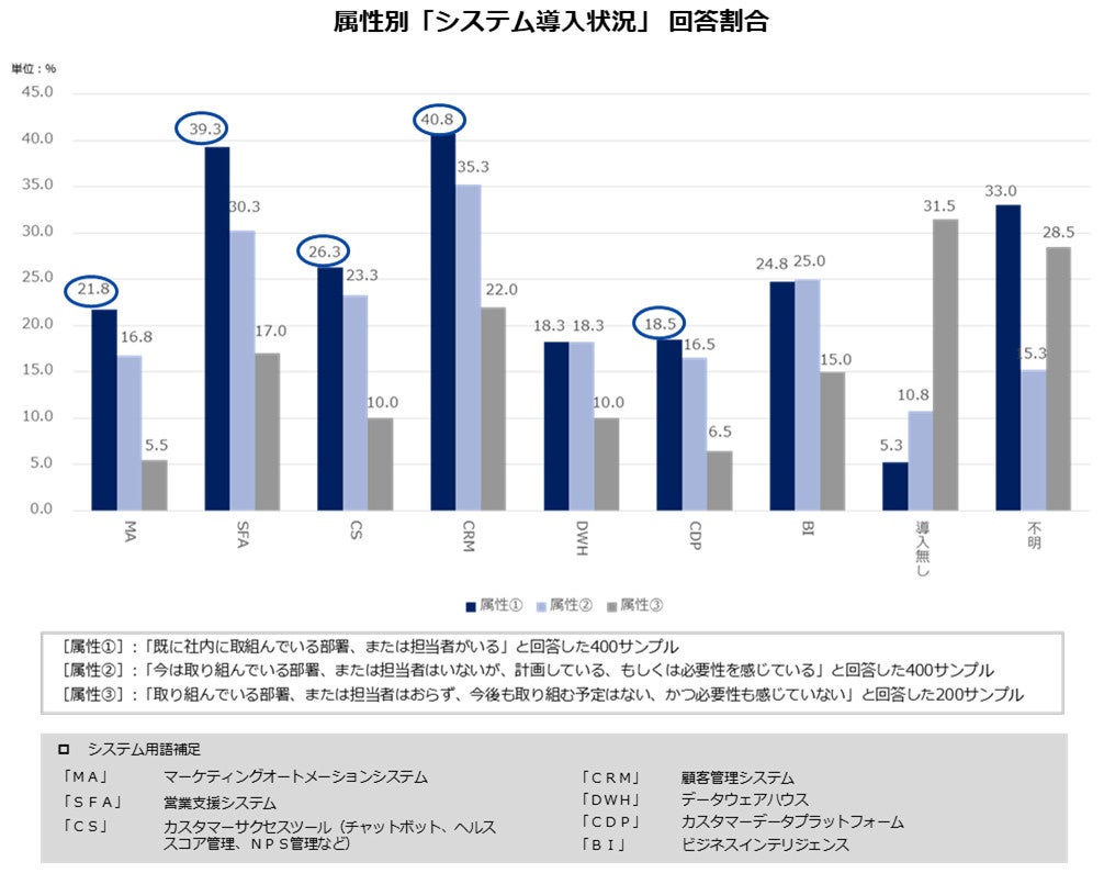 システム導入状況については、「導入無し」「不明」を除くと、回答割合が最も高く尚且つその項目数が一番多い属性は、[属性①]であり、「MA」「SFA」「CS」「CRM」「CDP」で最も高い状況です。