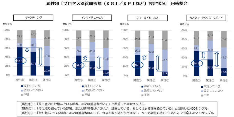 プロセス別管理指標(KGI/KPIなど)設定については、どのプロセスにおいても[属性①]の「設定している」と回答した割合が他の属性に比べて最も高い状況です。