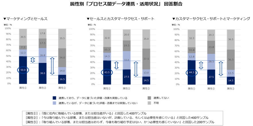加えて[属性①]は他の属性に比べて、どのプロセスとも「連携しており、データに基づいた評価・改善も実施している」と回答した割合の差が10ポイント以上高い状況です。