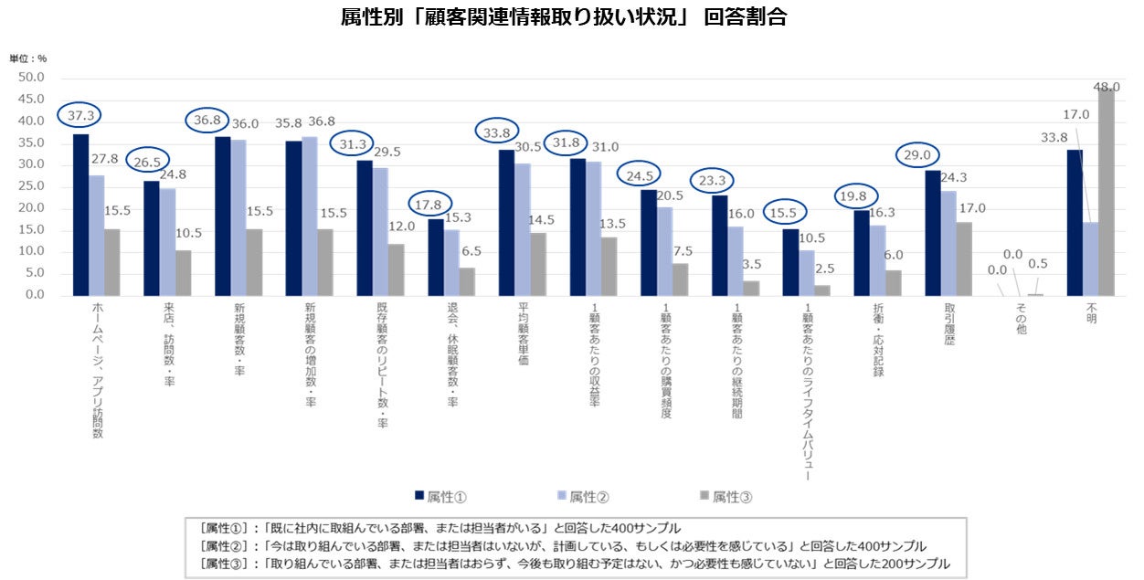 その[属性①]は他の属性に比べて、目標となる管理指標(KGI/KPIなど)を設定している割合が多く、またその設定したKGIやKPI達成状況を把握するために様々な顧客関連情報(サイトへの訪問数や顧客の購買行動に関する情報)を取得している割合も高いことが分かりました。