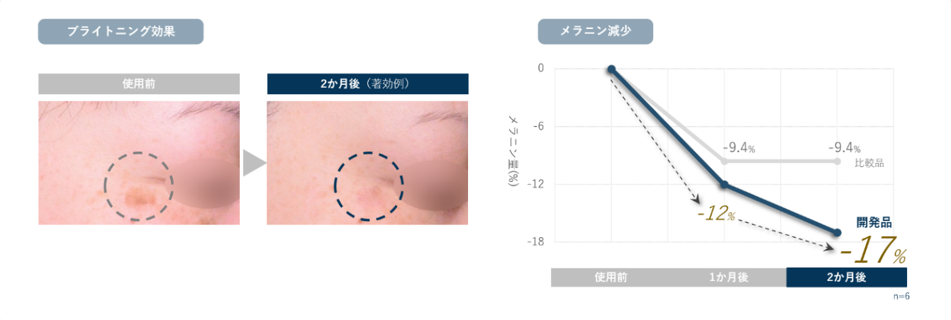 本技術を搭載した開発品と比較品を半顔ずつ使用し続け、頬のメラニン量を測定した結果、開発品を使用する度にメラニン量は減少し、使用後2ヶ月の時点では-17%になりました。その後も使い続けることで、ブライトニング効果を維持・向上させることが期待できます。