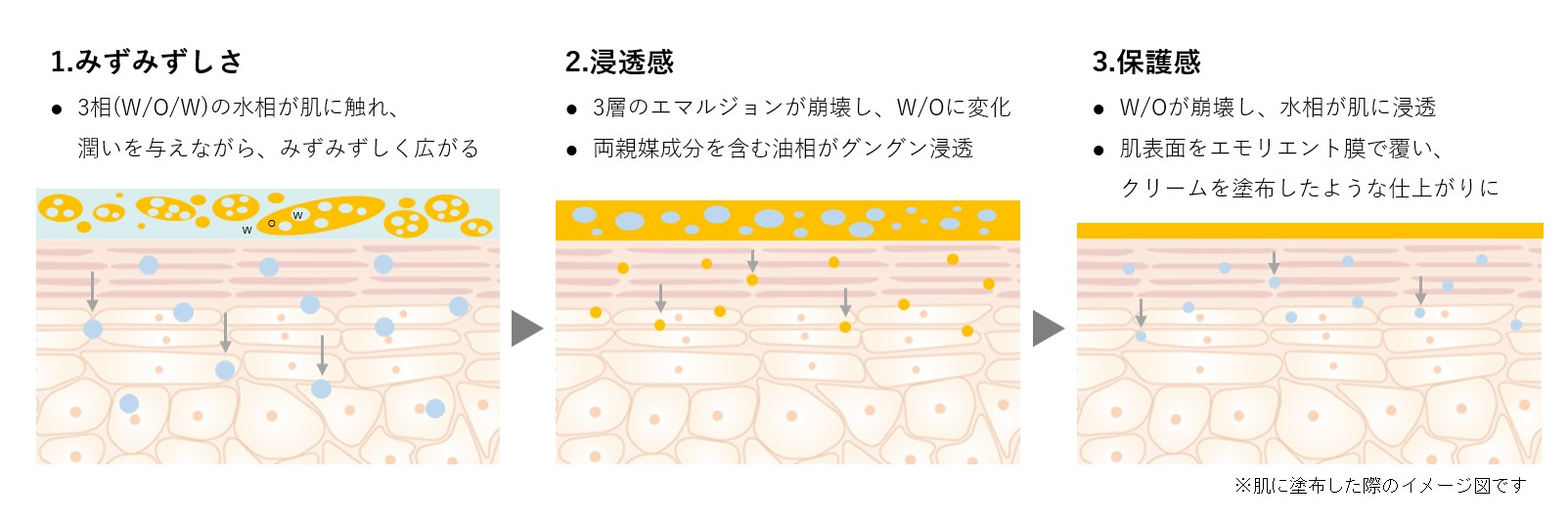 塗布した瞬間は、WOW処方の第1層(水相)が角質にうるおいを与え、「みずみずしさ」を体感できます。その後、肌との親和性が高い両親媒性成分を配合した第2層(油相)が、しっかりと肌に浸透し、ブライトニング成分の「浸透感」を体感。そして、第2層が浸透し切る前に、第3層(水相)が角質になじみはじめ、最後は十分に水分を含んだ肌の表面をエモリエント膜が覆い、クリームを塗ったような「保護感」を得られます。