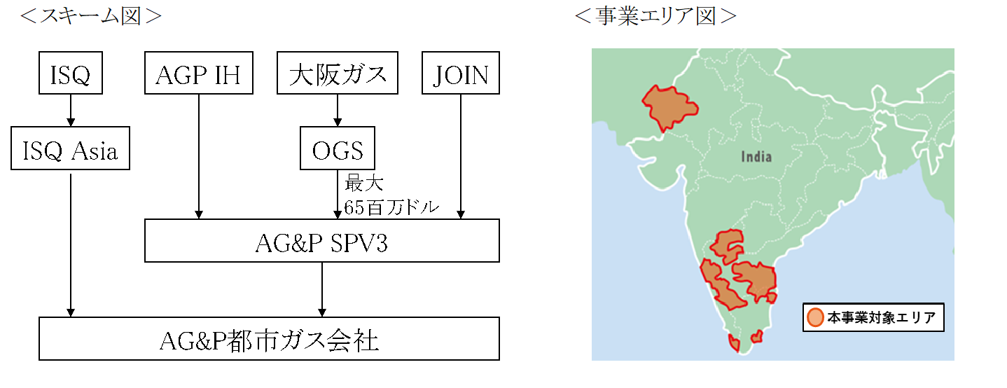 大阪ガス株式会社(社長:藤原 正隆)は、子会社であるOSAKA GAS SINGAPORE PTE. LTD.(社長:平林 幹由、以下「OGS」)を通じて、株式会社海外交通・都市開発事業支援機構(社長:武貞 達彦、以下「JOIN」)とともにAG&P CGD HoldCo SPV3(Singapore)Pte. Ltd.(以下「AG&P SPV3」)に出資することで、AG&P LNG CGD HoldCo Pte. Ltd.(以下「AG&P都市ガス会社」)が行うインドにおける都市ガス事業に参画しました。本件は、日本企業として初めてのインド都市ガス事業への参画になります。